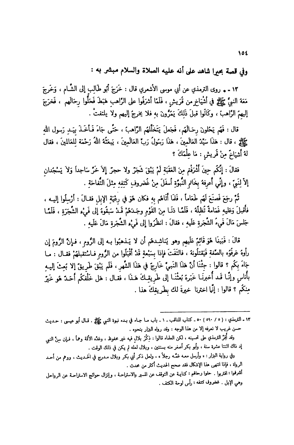 13 - * روى الترمذي عن أبي موسى الأشعري قال: خرج أبو طالب إلى الشام، وخرج معه النبي صلى الله عليه وسلم في أشياخ من قريش، فلما أشرفوا على الراهب هبط فحلوا رحالهم، فخرج إليهم الراهب، وكانوا قبل ذلك يمرون به فلا يخرج إليهم ولا يلتفت.