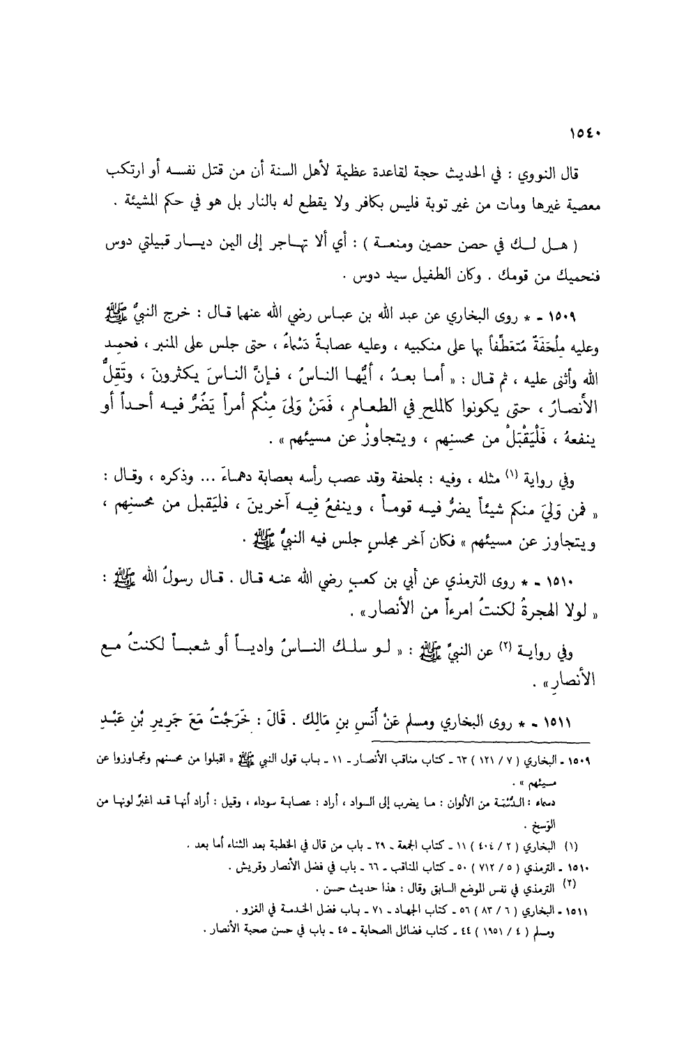 1509 - * روى البخاري عن عبد الله بن عباس رضي الله عنهما قال: خرج النبي صلى الله عليه وسلم وعليه ملحفةً متعطفاً بها على منكبيه، وعليه عصابةٌ دسماءُ، حتى جلس على المنبر، فحمد لله أثنى عليه، ثم قال: "أما بعدُ، أيها الناسُ، فإن الناس يكثرون، وتقِلُّ الأنصارُ، حتى يكونوا كالملح في الطعام، فمن ولى منكم أمراً يضُرُّ فيه أحدا أو ينفعه، فليقبلْ من محسنهم، ويتجاوز عن مسيئهم".