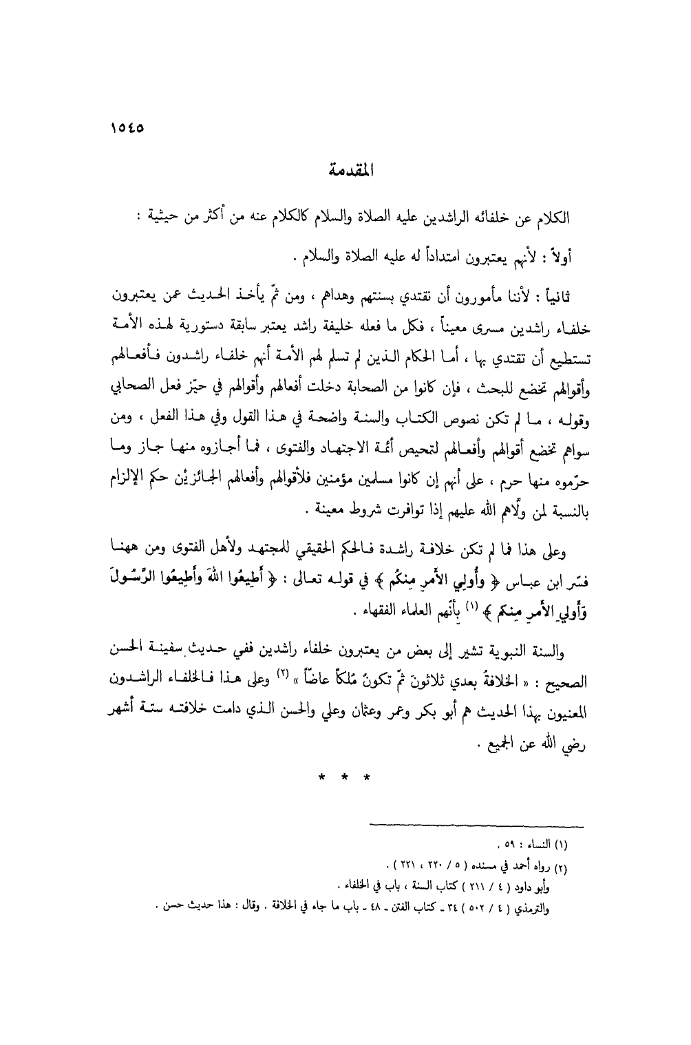 ثانياً: لأننا مأمورون أن نقتدي بسنتهم وهداهم، ومن ثم يأخذ الحديث عمن يعتبرون خلفاء راشدين مسرى معيناً، فكل ما فعله خليفة راشد يعتبر سابقة دستورية لهذه الأمة تستطيع أن تقتدي بها، أما الحكام الذين لم تسلم لهم الأمة أنهم خلفاء راشدون فأفعالهم وأقوالهم تخضع للبحث، فإن كانوا من الصحابة دخلت أفعالهم وأقوالهم في حيز فعل الصحابي وقوله، ما لم تكن نصوص الكتاب والسنة واضحة في هذا القول وفي هذا الفعل، ومن سواهم تخضع أقوالهم وأفعالهم لتمحيص أئمة الاجتهاد والفتوى، فما أجازوه منها جاز وما حرموه منها حرم، على أنهم إن كانوا مسلمين مؤمنين فلأقوالهم وأفعالهم الجائزين حكم الإلزام بالنسبة لمن ولاهم الله عليهم إذا توافرت شروط معينة.