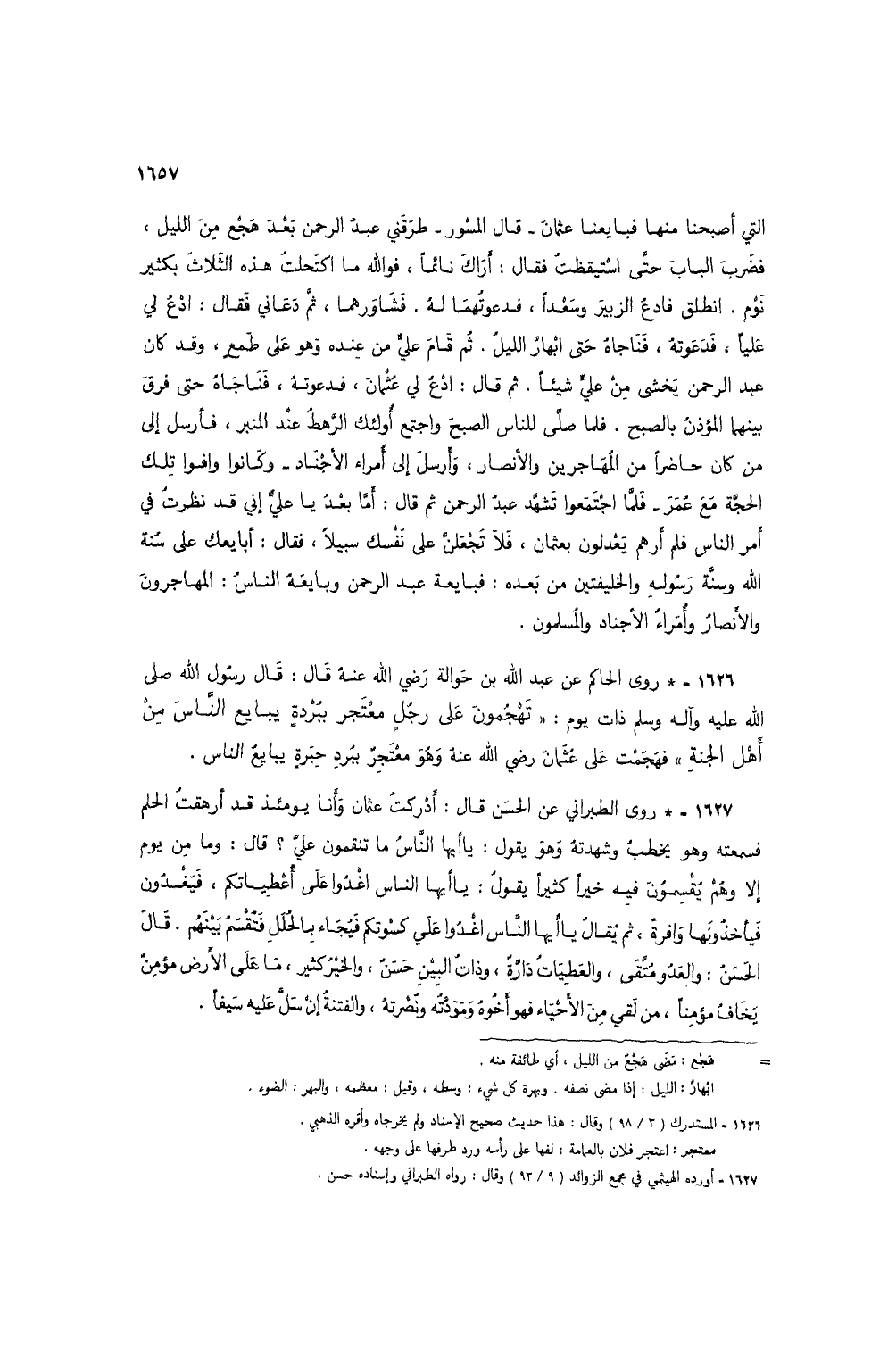 1626 - * روى الحاكم عن عبد الله بن حوالة رضي الله عنه قال: قال رسول الله صلى الله عليه وآله ذات يوم: "تهجمون على رجل معتجر ببردة يباع الناس من أهل الجنة" فهجمت على عثمان رضي الله عنه وهو معتجر ببرد حبرة يباع الناس.