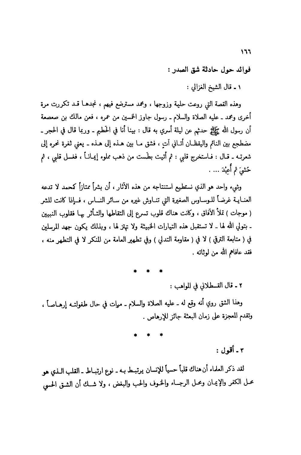 وهذه القصة التي روعت حليمة وزوجها، ومحمد مسترضع فيهم، نجدها قد تكررت مرة أخرى ومحمد - عليه الصلاة والسلام - رسول جاوز الخمسين من عمره، فعن مالك بن صعصعة أن رسول الله صلى الله عليه وسلم حدثهم عن ليلة أسري به قال: بينا أنا في الحطيم - وربما قال في الحجر - مضطجع بين النائم واليقظان أتاني آتٍ، فشق ما بين هذه إلى هذه - يعني ثغرة نحره إلى شعرته - قال: فاستخرج قلبي: ثم أتيت بطست من ذهب مملوء إيماناً، فغسل قلبي، ثم حُشيَ ثم أُعيد ... .