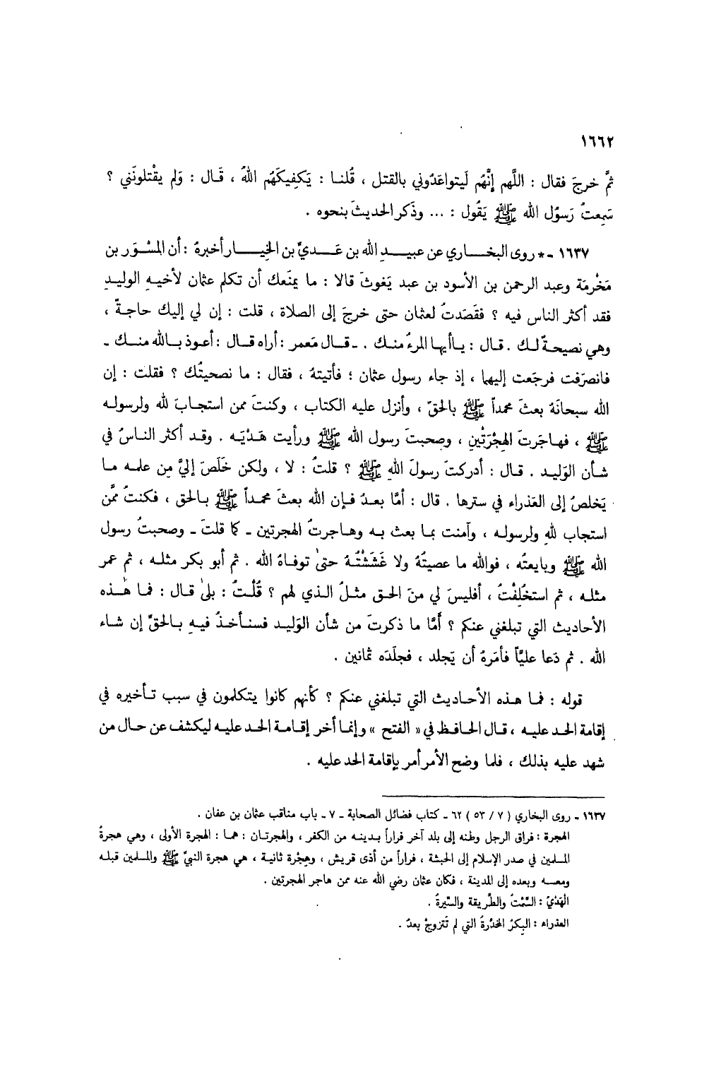 1637 - * روى البخاري عن عبيد الله بن عدي بن الخيار أخبره: أن المسور بن مخرمة وعبد الرحمن بن الأسود بن عبد يغوث قالا: ما يمنعك أن تكلم عثمان لأخيه الوليد فقد أكثر الناس فيه؟ فقصدت لعثمان حتى خرج إلى الصلاة، قلت: إن لي إليك حاجة، وهي نصيحة لك، قال: يا أيها المرء منك، قال معمر: أراه قال: أعوذ بالله منك- فأنصرفت فرجعت إليهما، إذا جاء رسول عثمان: فأتيته، فقال: ما نصيحتك؟ فقلت: إن الله سبحانه بعث محمداً صلى الله عليه وسلم بالحق، وأنزل عليه الكتاب، وكنت ممن استجاب لله ولرسوله صلى الله عليه وسلم، فهاجرت الهجرتين، وصحبت رسول الله صلى الله عليه وسلم ورأيت هدية، وقد أكثر الناس في شأن الوليد، قال: أدركت رسول الله صلى الله عليه وسلم؟ قلتُ: لا، ولكن خلص إلى من علمه ما يخلص إلى العذارء في سترها. قال: أما بعد فإن الله بعث محمداً صلى الله عليه وسلم بالحق، فكنت ممن استجاب لله ولرسوله، وأمنت بما بعث به وهاجرت الهجرتين - كما قلت- وصحبت رسول الله صلى الله عليه وسلم وبايعته، فو الله ما عصيته ولا غششته حتى توفاه الله، ثم أبو بكر مثله، ثم عمر مثله، استخلفت، أفليس لي من الحق مثل الذي هم؟ قلت: بلي قال: فما هذه الأحاديث التي تبلغني عنكم؟ أما ما ذكرت من شأن الوليد فسنأخذ فيه بالحق إن شاء الله، ثم دعا علياً فأمره أن يجلد، فجلده ثمانين (1)