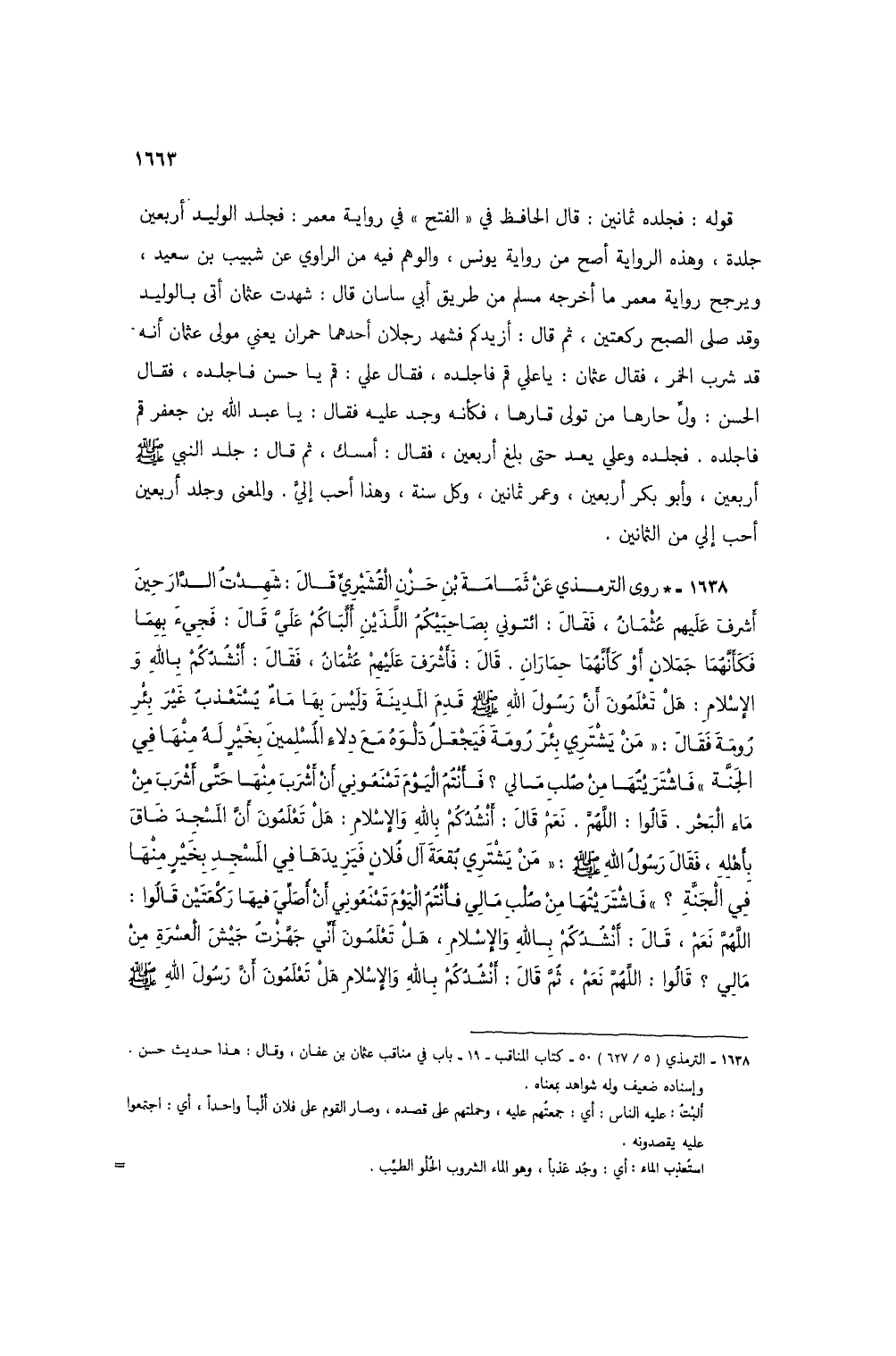قوله: فجلده ثمانين: قال الحافظ في "الفتح" في رواية معمر" فجلد الوليد أربعين جلدة، وهذه الرواية أصح من رواية يونس، والوهم فيه من الراوي عن شيب بن سعيد، ويرجح رواية معمر ما أخرجه مسلم من طريق أبي ساسان قال: شهدت عثمان أتى بالوليد وقد صلى الصبح ركعتين، ثم قال: أزيدكم فشهد رجلان أحدهما حمران يعني مولى عثمان أنه. قد شرب الخمر، فقال عثمان: يا علي فاجلده، فقال علي: قم يا حسن فاجلده، فقال الحسن: ولِّ حارها من تولى قارها، فكأنه وجد عليه فقال: يا عبد الله بن جعفر قم فاجلده، فجلده وعلي يعد حتى بلغ أربعين، فقال: امسك، ثم قال: جلد النبي صلى الله عليه وسلم أربعين، فقال: امسك، ثم قال: جلد النبي صلى الله عليه وسلم أربعين، وأبو بكر أربعين، وعمر ثمانين، وكل سنة، وهذا أحب إلي، والمعني وجلد أربعين أحب إلى من الثمانين 1638 - * روى الترمذي عن ثمامة بن حزن القشيري قال: شهدت الدار حين أشرف عليهم عثمان، فقال: ائتنوني بصاحبيكم اللذين ألباكم علي قال: فجيء بهما فكأنهما جملان أو كأنهما حماران، قال: فأشرف عليهم عثمان، فقال: أنشدكم بالله والإسلام: هل تعلمون أن رسول الله صلى الله عليه وسلم قدم المدينة وليس بها ماء يستعذب غير بئر رومة فقال: "من يشتري بئر رومة فيجعل دلوه مع دلاء المسلمين بخير له منها في الجنة" فاشتريتها من صلب مالي؟ فأنتم اليوم تمنعوني أن أشرب منها حتى أشرب من ماء البحر، قالوا: اللهم. نعم قال: أنشدكم بالله والإسلام: هل تعلمون أن المسجد ضاق بأهله، فقال رسول الله صلى الله عليه وسلم: "من يشتري بقعة أل فلان فيزيدها في المسجد بخير منها في الجنة؟ " فاشتريتها من صلب مالي فأنتم اليوم تمنعوني أن أصلى فيها ركعتين قالوا: اللهم نعم، قال: أنشدكم بالله والإسلام، هل تعلمون أني جهزت جيش العشرة من مالي؟ قال: اللهم نعم، ثم قال: أنشدكم بالله والإسلام هل تعلمون أن رسول الله صلى الله عليه وسلم
