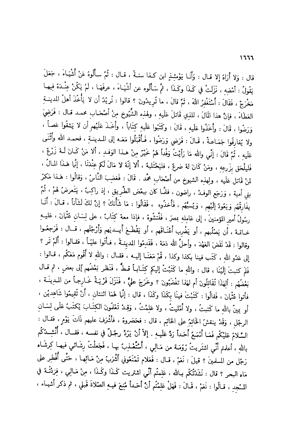 قال: ولا أراه إلا قال: وأنا يومئذ ابن كذا سنة، قال: ثم سألوه عن أشياء، جعل يقول: أمضه، نزلت في كذا وكذا، ثم سألوه عن أشياء، عرفها، لم يكن عنه فيها مخرج، فقال: استغفر الله، ثم قال: ما تريدون؟ قال: نريد أن لا يأخذ أهل المدينة العطاء، فإن هذا المال، للذي قاتل عليه، ولهذه الشيوخ من أصحاب محمد قال: فرضي ورضوا، قال: وأخذوا عليه، قال: وكتبوا عليه كتاباً، وأخذ عليهم أن لا يشقوا غصاً، ولا يفارقوا جماعة، قال: فرضي ورضوا، فأقبلوا معه إلى المدينة، فحمد الله وأثني عليه، ثم قال: إني والله ما رأيت وفداً هم خير من هذا الوفد، ألا من كان له زرع، فليلحق بزرعه، ومن كان له ضرع، فليحتلبه، ألا إنه لا مال لكم عندنا، إنما هذا المال، لمن قاتل عليه، ولهذه الشيوخ من أصحاب محمد، قال: فغضب الناس، وقالوا: هذا مكر بنى أمية، ورجع الوفد، راضون، فلما كان ببعض الطريق، إذا راكب، يتعرض لهم، ثم يفارقهم، ويعود إليهم، ويسبهم، فأخذوه، فقالوا: ما شأنك؟ إن لك لشأنا، قال: أنا رسول أمير المؤمنين، إلى عامله بمصر، ففتشوه، فإذا معه كتاب، على لسان عثمان، عليه خاتمه، أن يصلبهم، أو يضرب أعناقهم، أو يقطع أيديهم وأرجلهم، قال: فرجعوا وقالوا: قد نقض العهد، وأحل الله ذمة، فقدموا المدينة، فأتوا علياً، فقالوا: ألم تر؟ إلى عدو الله، كتب فينا بكذا وكذا، قم معنا إليه، فقال: والله لا أقوم معكم، قالوا: فلم كتبت إلينا، قال: والله ما كتبت إليكم كتاباً قط، فنظر بعضهم على بعض، ثم بعضهم: ألهذا تقاتلون أم لهذا تغضبون؟ وخرج علي، فنزل قرية خارجاً من المدينة، فأتوا عثمان، فقالوا: كتبت فينا بكذا وكذا، قال: إنما هما اثنتان، أن تقيموا شاهدين، أو يمين بالله ما كتبت، ولا أمليت، ولا علمت، وقد تعلمون الكتاب يكتب على لسان الرجل، وقد ينقش الخاتم على الخاتم، قال: فحصروه، فأشرف عليهم ذات يوم، فقال: السلام عليكم فما أسمع أحداً على الخاتم، قال: فحصروه، فأشرف عليهم ذات يوم، فقال: السلام عليكم فما أسمع أحداً رد عليه، إلا أن يرد رجل في نفسه، فقال، أنشدكم بالله، أعلمتم أني اشتريت رومة من مالي، استعذب بها، فجعلت رثائي فيها كرشاء رجل من المسلمين؟ قيل: نعم، قال: فعلام تمنعوني أشرب من مائها، حتى أفطر على ماء البحر؟ قال: نشدتكم بالله، علمتم أني اشتريت كذا وكذا، من مالي، فزدته في المسجد، قالوا: نعم، قال: فهل علمتم أن أحداً منع فيه الصلاة قبلي، ثم ذكر أشياء،