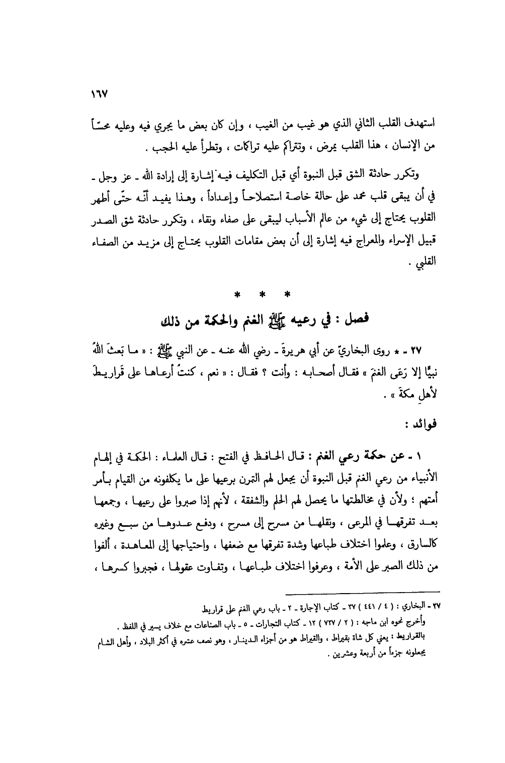 27 - * روى البخاري عن أبي هريرة - رضي الله عنه - عن النبي صلى الله عليه وسلم: "ما بعث الله نبياً إلا رعى الغنم" فقال أصحابه: وأنت؟ فقال: "نعم، كنتُ أرعاها على قراريط لأهل مكة".