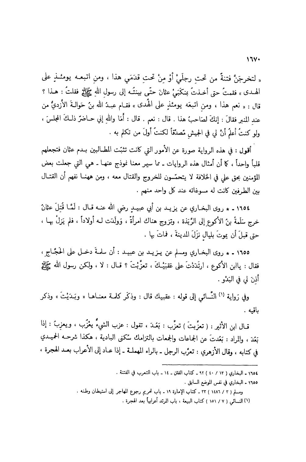 1655 - * روى البخاري ومسلم عن يزيد بن عبيد: أن سلمة دخل على الحجاج، فقال: يا ابن الأكوع، ارتددت على عقبيك، تعزبت؟ قال: لا، ولكن رسول الله صلى الله عليه وسلم أذن لي في البدو.