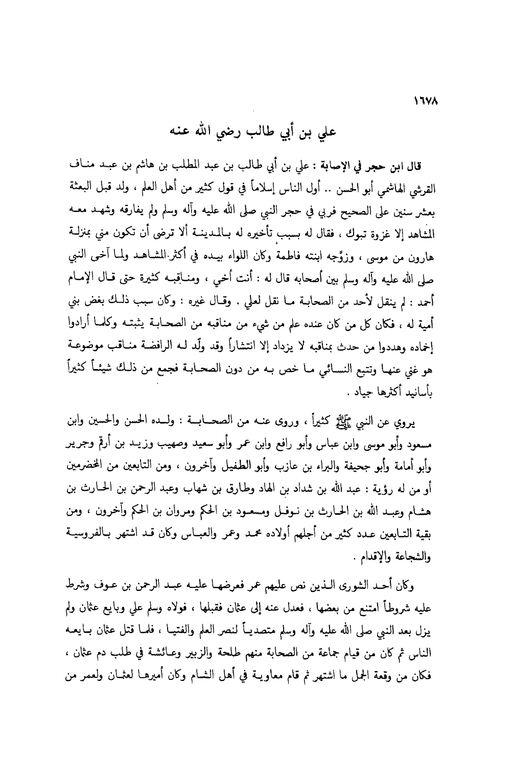 قال ابن حجر في الإصابة: على بن أبي طالب بن عبد المطلب بن هاشم بن عبد مناف القوضي الهاشمي أبو الحسن .. أول الناس إسلاماً في قول كثير من أهل العلم، ولد قبل البعثة بعشر سنين على الصحيح فربي في حجر النبي صلى الله عليه وآله وسلم ولم يفارقه وشهد معه المشاهد إلى غزوة تبوك، فقال له بسبب تأخيره له بالمدينة ألا ترضي أن تكون مني بمنزلة هارون من موسى، وزوجة ابنته فاطمة وكان اللواء بيده في أكثر المشاهد ولما أخي النبي صلى الله عليه وآله وسلم بين أصحابه قال له: أنت أخي، ومناقبه كثيرة حتى قال الإمام أحمد: لم ينقل لأحد من الصحابة ما نقل لعلي، وقال غيره: وكان سبب ذلك بغض بني أمية له، فكان كل من كان عنده علم من شيء من مناقبه من الصحابة يثبته وكلما أرادوا إخماده وهددوا من حدث بمناقبه لا يزداد إلا انتشاراً وقد ولد له الرافضة مناقب موضوعة هو غني عنها وتتبع النسائي ما خص به من دون الصحابة فجمع من ذلك شيئاً كثيراً بأسانيد أكثرها جياد.