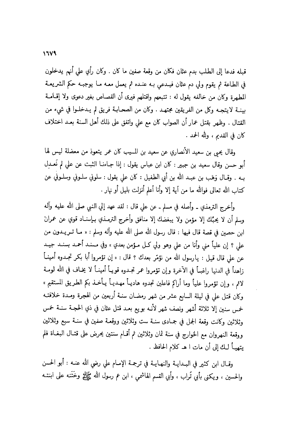 وأخرج الترمذي - وأصله في مسلم - من علي قال: لقد عهد إلى النبي صلى الله عليه وآله وسلم أن لا يحبك إلا مؤمن, لا يبغضك إلا منافق وأخرج الترمذي بإسناده قوي عن عمران ابن حصين في قصة قال فيها: قال رسول الله صلى الله عليه وآله وسلم: "ما تريدون علي؟ إن علياً مني وأنا من علي وهو ولي كل مؤمن بعدي" وفي مسند أحمد بسند جيد عن علي قال قيل: يا رسول الله من نؤمر بعدك؟ قال: "إن تؤمروا أبا بكر تجدوه أميناً زاهداً في الدنيا راغباً في الآخرة وإن تؤمروا عمر تجدوه قوياً أميناً لا يخاف في الله لومة لائم، وإن تؤمروا علياً وما أراكم فاعلين تجدوه هادياً مهدياً يأخذ بكم الطريق المستقيم"وكان قتل علي في ليلة السابع عشر من شهر رمضان سنة أربعين من الهجرة ومدة خلافته خمس سنين إلا ثلاثة أشهر ونصف شهر لأنه بويع بعد قتل عثمان في ذي الحجة سنة خمس وثلاثين وكانت وقعة الجمل في جمادي سنة ست وثلاثين ووقعة صفين في سنة سبع وثلاثين ووقعة النهروان مع الخوارج في سنة وثلاثين ثم أقام سنتين يحرض على قتال البغاة فلم يتهيأ لك إلى أن مات أهـ كلام الحافظ.