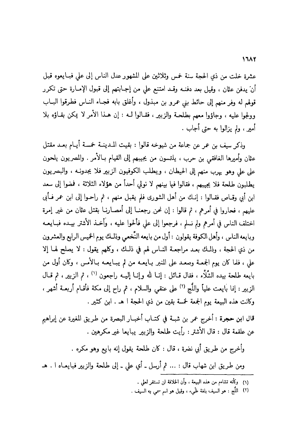 وذكر سيف بن عمر عن جماعة من شيوخه قالوا: بقيت المدينة خمسة أيام بعد مقتل عثمان وأميرها الغافقي بن حرب، يلتمسون من يجيبهم إلى القيام بالأمر. والمصريون يلحون على علي وهو يهرب منهم إلى الحيطان، ويطلب الكوفيون الزبير فلا يجدونه، والبصريون يطلبون طلحة فلا يجيبهم، فقالوا فيما بينهم لا نولي أحدًا من هؤلاء الثلاثة، فمضوا إلى سعد ابن أبي وقاص فقالوا: إنك من أهل الشورى فلم يقبل منهم، ثم راحوا إلى ابن عمر فأبى عليهم، فحاروا في أمرهم، ثم قالوا: إن نحن رجعنا إلى أمصارنا بقتل عثمان من غير إمرة اختلف الناس في أمرهم ولم نسلم، فرجعوا إلى علي فألحوا عليه، وأخذ الأشتر بيده فبايعه وبايعه الناس، وأهل الكوفة يقولون: أول من بايعه النخعي وذلك يوم الخميس الرابع والعشرون من ذي الحجة، وذلك بعد مراجعة الناس لهم في ذلك، وكلهم يقول: لا يصلح لها إلا علي، فلما كان يوم الجمعة وصعد على المنبر بايعه من لم يبايعه بالأمس، وكان أول من بايعه طلحة بيده الشلاء، فقال قائل: إنا لله وإنا إليه راجعون (1)، ثم الزبير، ثم قال الزبير: إنما بايعت عليًا واللج (2) على عنقي والسلام، ثم راح إلى مكة فأقام أربعة أشهر، وكانت هذه البيعة يوم الجمعة لخمسة بقين من ذي الحجة اهـ. ابن كثير.