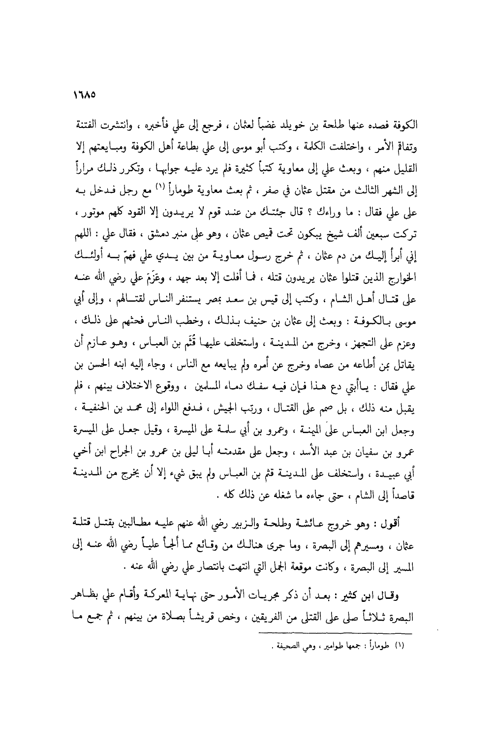 الكوفة فصده عنها طلحة بن خويلد غضبًا لعثمان، فرجع إلى علي فأخبره، وانتشرت الفتنة وتفاقم الأمر، واختلفت الكلمة، وكتب أبو موسى إلى علي بطاعة أهل الكوفة ومبايعتهم إلا القليل منهم، وبعث علي إلى معاوية كتبًا كثيرة فلم يرد عليه جوابها، وتكرر ذلك مرارًا إلى الشهر الثالث من مقتل عثمان في صفر، ثم بعث معاوية طومارًا (1) مع رجل فدخل به على علي فقال: ما وراءك؟ قال جئتك من عند قوم لا يريدون إلا القود كلهم موتور، تركت سبعين ألف شيخ يبكون تحت قميص عثمان، وهو على منبر دمشق، فقال علي: اللهم إني أبرأ إليك من دم عثمان، ثم خرج رسول معاوية من بين يدي علي فهم به أولئك الخوارج الذين قتلوا عثمان يريدون قتله، فما أفلت إلا بعد جهد، وعزم علي رضي الله عنه على قتال أهل الشام، وكتب إلى قيس بن سعد بمصر يستنفر الناس لقتالهم، وإلى أبي موسى بالكوفة: وبعث إلى عثمان بن حنيف بذلك، وخطب الناس فحثهم على ذلك، وعزم على التجهز، وخرج من المدينة، واستخلف عليها قثم بن العباس، وهو عازم أن يقاتل بمن أطاعه من عصاه وخرج عن أمره ولم يبايعه مع الناس، وجاء إليه ابنه الحسن بن علي فقال: يا أبتي دع هذا فإن فيه سفك دماء المسلمين، ووقوع الاختلاف بينهم، فلم يقبل منه ذلك، بل صمم على القتال، ورتب الجيش، فدفع اللواء إلى محمد بن الحنفية، وجعل ابن العباس على الميمنة، وعمرو بن أبي سلمة على الميسرة، وقيل جعل على الميسرة عمرو بن سفيان بن عبد الأسد، وجعل على مقدمته أبا ليلى بن عمرو بن الجراح ابن أخي أبي عبيدة، واستخلف على المدينة قثم بن العباس ولم يبق شيء إلا أن يخرج من المدينة قاصدًا إلى الشام، حتى جاءه ما شغله عن ذلك كله.