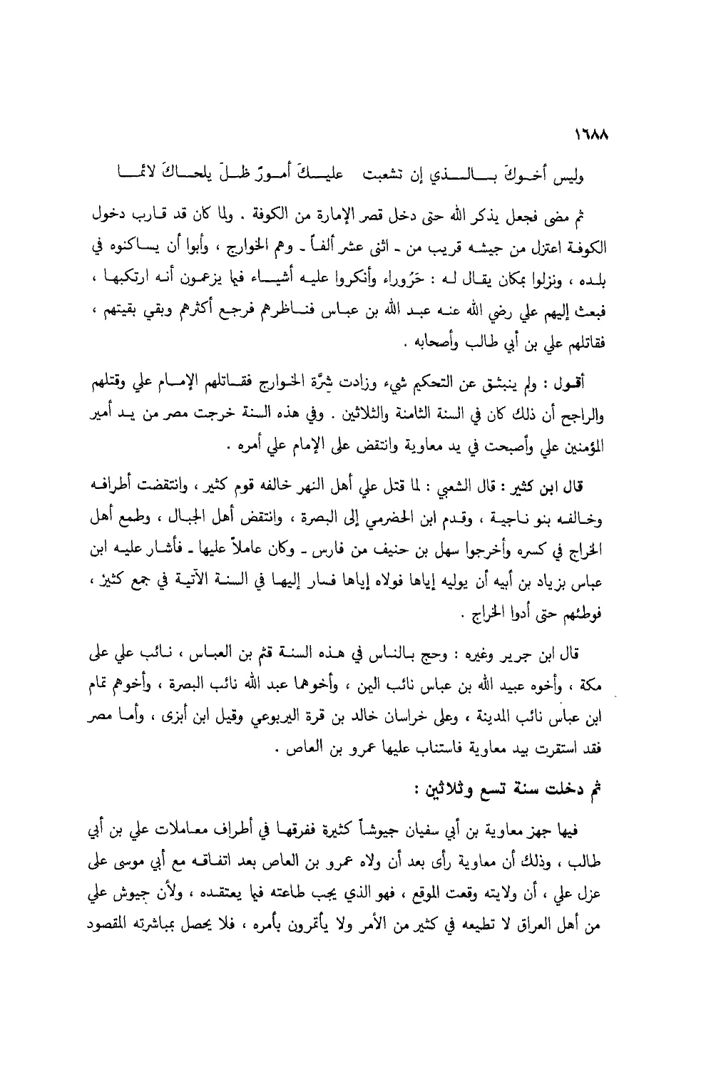 أقول: ولم ينبثق عن التحكيم شيء وزادت شرة الخوارج فقاتلهم الإمام علي وقتلهم والراجح أن ذلك كان في السنة الثامنة والثلاثين. وفي هذه السنة خرجت مصر من يد أمير المؤمنين علي وأصبحت في يد معاوية وانتفض على الإمام علي أمره.