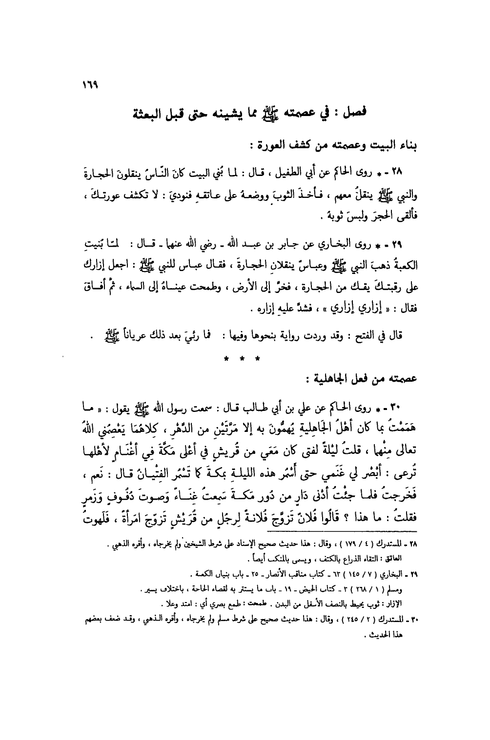 28 - * روى الحاكم عن أبي الطفيل، قال: لما بُني البيت كان الناسُ ينقلون الحجارة والنبي صلى الله عليه وسلم ينقل معهم، فأخذ الثوب ووضعه على عاتقه فنودي: لا تكشف عورتك، فألق الحجر ولبس ثوبه.
