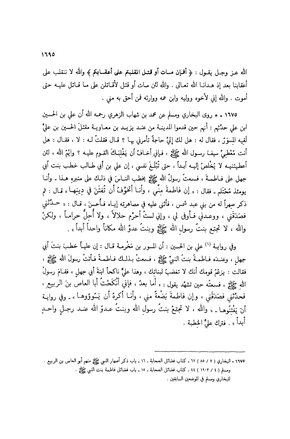 1675 - * روى البخاري ومسلم عن محمد بن شهاب الزهري رحمه الله أن علي بن الحسين ابن علي حدثهم: أنهم حين قدموا المدينة من عند يزيد بن معاوية مقتل الحسين بن علي لقيه المسور، فقال له: هل لك إلي حاجة تأمرني بها؟ قال فقلت له: لا، فقال: هل أنت معطي سيف رسول الله صلى الله عليه وسلم، فإني أخاف أن يغلبك القوم عليه؟ وايم الله، لئن أعطيتنيه لا يخلص إليه أبدًا، حتى تبلغ نفسي، إن علي بن أبي طالب خطب بنت أبي جهل على فاطمة، فسمعت رسول الله صلى الله عليه وسلم يخطب الناس في ذلك على منبره هذا -وأنا يومئذ محتلم- فقال: "إن فاطمة مني، وأنا أتخوف أن تفتن في دينها" قال: ثم ذكر صهرًا له من بني عبد شمس، فأثنى عليه في مصاهرته إياه فأحسن، قال: "حدثني فصدقني، ووعدني فأوفى لي، وإني لست أحرم حلالاً، ولا أحل حرامًا، ولكن والله، لا تجتمع بنت رسول الله صلى الله عليه وسلم وبنت عدو الله مكانًا واحدًا أبدًا".