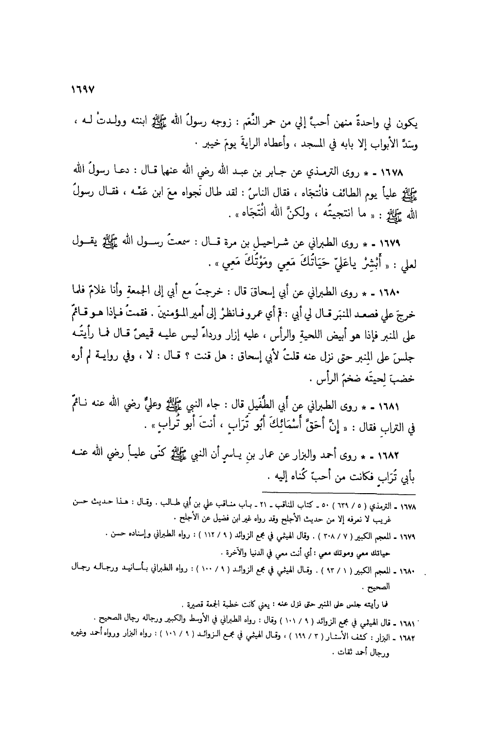1682 - * روى أحمد والبزار عن عمار بن ياسر أن النبي صلى الله عليه وسلم كنى عليًا رضي الله عنه بأبي ترابٍ فكانت من أحب كناه إليه.