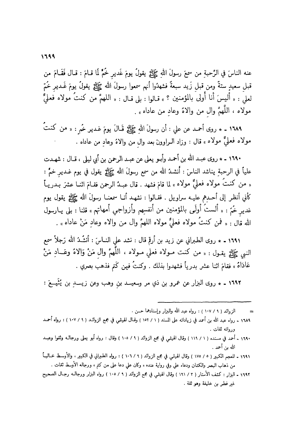 1689 - * روى أحمد عن علي: أن رسول الله صلى الله عليه وسلم قال يوم غدير خم: "من كنت مولاه فعلي مولاه" قال: وزاد الراوون بعد وال من والاه وعاد من عاداه.