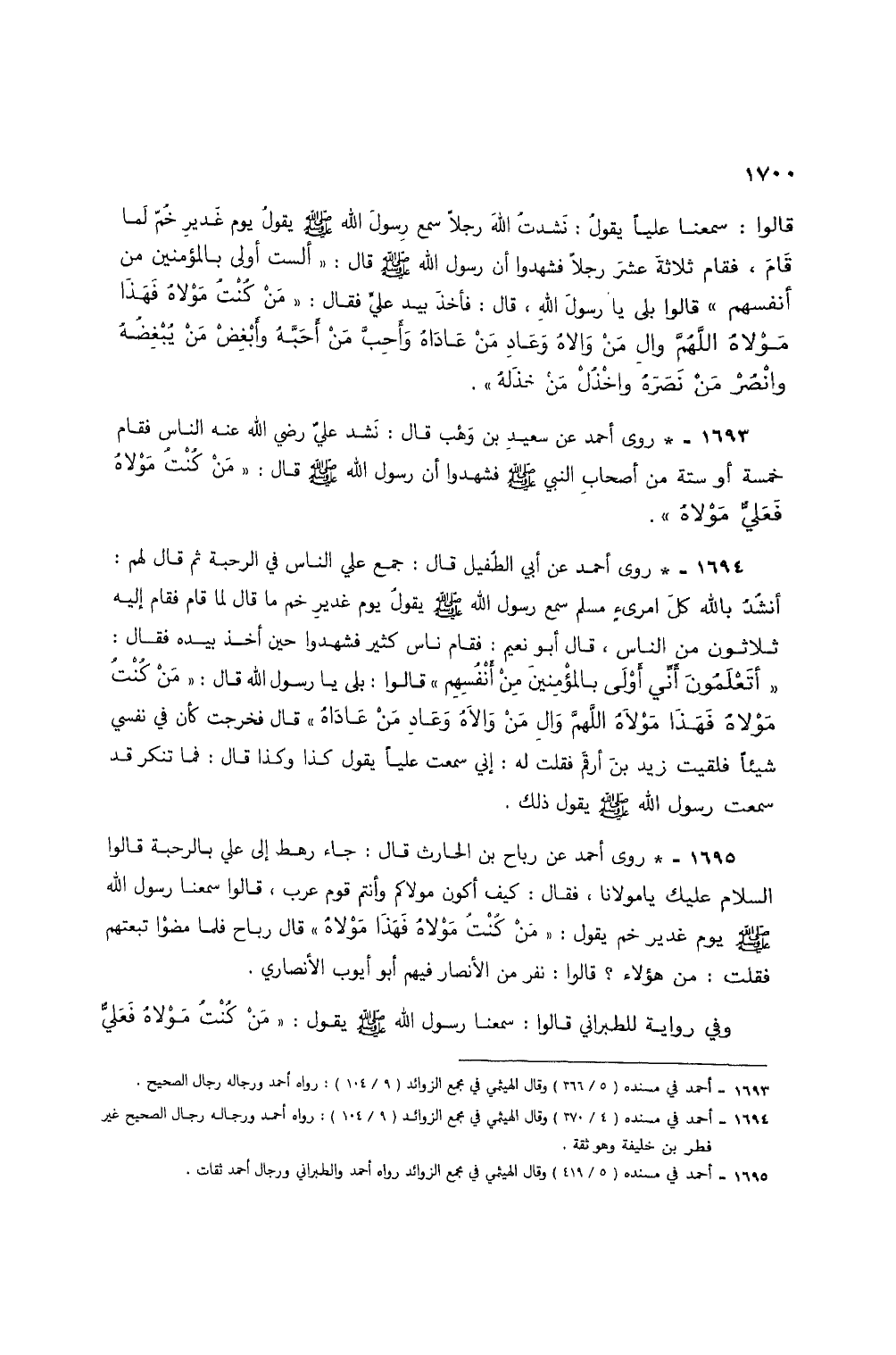 1693 - * روى أحمد عن سعيد بن وهب قال: نشد علي رضي الله عنه الناس فقام خمسة أو ستة من أصحاب النبي صلى الله عليه وسلم فشهدوا أن رسول الله صلى الله عليه وسلم قال: "من كنت مولاه فعلي مولاه".