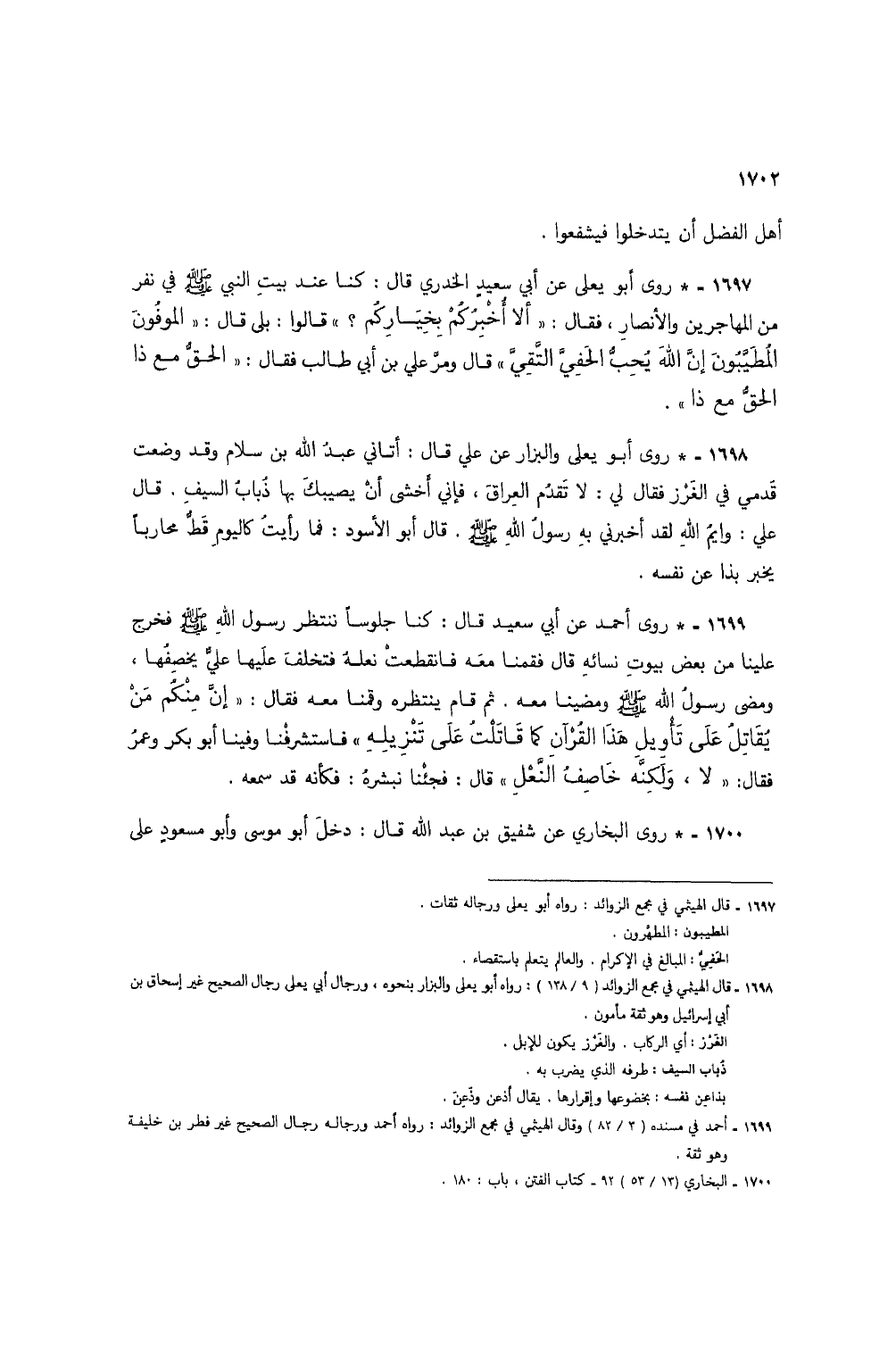 1697 - * روى أبو يعلى عن أبي سعيد الخدري قال: كنا عند بيت النبي صلى الله عليه وسلم في نفر من المهاجرين والأنصار، فقال: "ألا أخبركم بخياركم؟ " قالوا: بلى قال: "الموفون المطيبون إن الله يحب الحفي التقي" قال ومر علي بن أبي طالب فقال: "الحق مع ذا الحق مع ذا".
