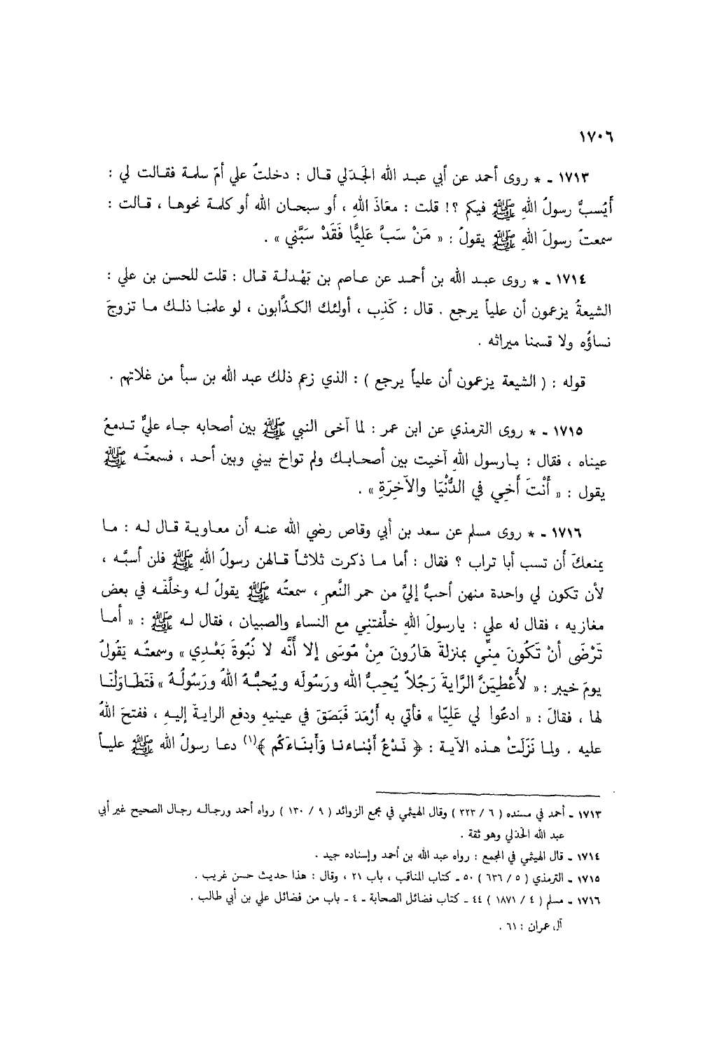 1713 - * روى أحمد عن أبي عبد الله الجدلي قال: دخلت على أم سلمة فقالت لي: أيسب رسول الله صلى الله عليه وسلم فيكم؟! قلت: معاذ الله، أو سبحان الله أو كلمة نحوها، قالت: سمعت رسول الله صلى الله عليه وسلم يقول: "منسب عليا فقد سبني".