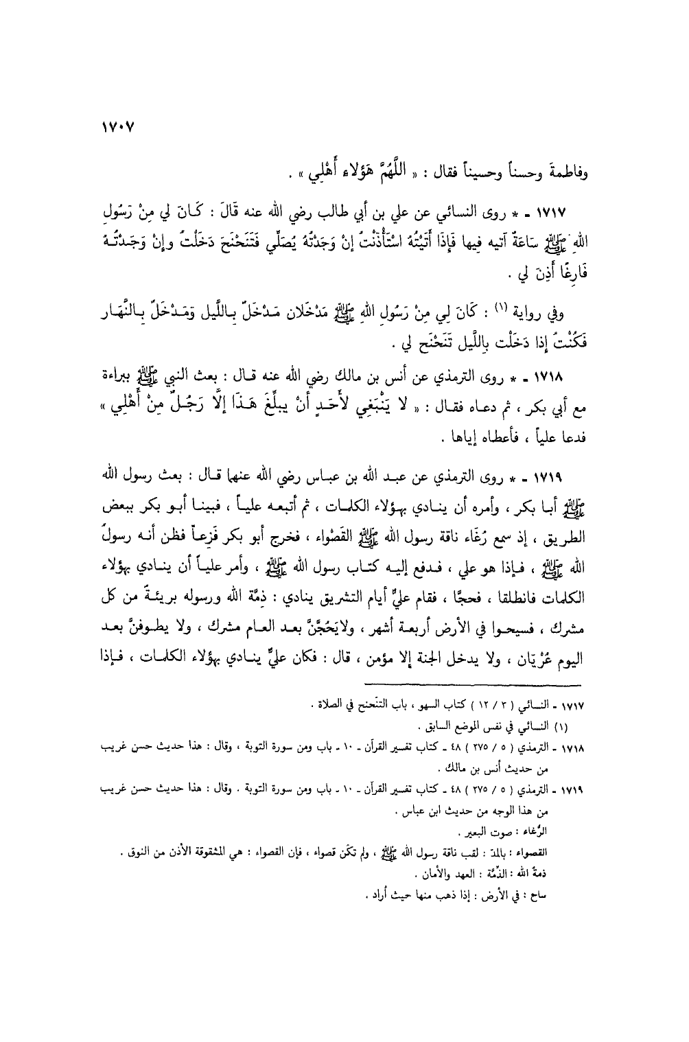 1719 - * روى الترمذي عن عبد الله بن عباس رضي الله عنهما قال: بعث رسول الله صلى الله عليه وسلم أبا بكر، وأمره أن ينادي بهؤلاء الكلمات، ثم أتبعه علياً، فبينا أبو بكر ببعض الطريق، إذ سمع رغاء ناقة رسول الله صلى الله عليه وسلم القصواء، فخرج أبو بكر فزعا فظن أنه رسول الله صلى الله عليه وسلم، فإذا هو علي، فدفع إليه كتاب رسول الله صلى الله عليه وسلم، وأمر علياً أن ينادي بهؤلاء الكلمات فانطلقا، فحجا، فقام على أيان التشريق ينادي: ذمة الله ورسوله بريئة من كل مشرك، فسيحوا في الأرض أربعة أشهر، ولا يحجن بعد العام مشرك، ولا يطوفن بعد اليوم عريان، ولا يدخل الجنة إلا مؤمن، قال: فكان علي ينادي بهؤلاء الكلمات، فإذا