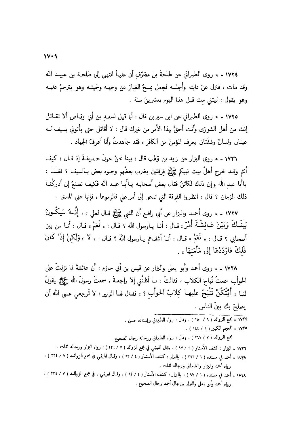 1728 - * روى أحمد وأبو يعلى والبزار عن قيس بن أبي حازم: أن عائشة لما نزلت على الحوأب سمعت نباح الكلاب، فقالت: ما أظنني إلا راجعة، سمعت رسول الله صلى الله عليه وسلم يقول لنا "أيتكن تنبح عليها كلاب الحوأب؟ " فقال لها الزبير: لا ترجعي عسى الله أن يصلح بك بين الناس