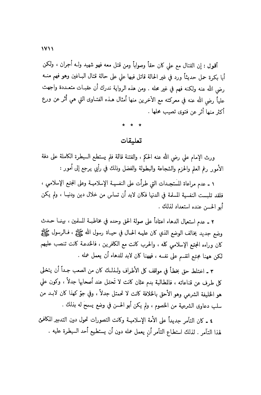 3 - اختلط حق بخطأ في موافق كل الأطراف ولذلك كان من الصعب جداً أن يتخلى كل طرف عن قناعاته، فالمطالبة بدم عثمان كانت لا تحتمل عند أصحابها جدلاً، وكون علي هو الخليفة الشرعي وهو الأحق بالخلافة كانت لا تحتمل جدلاً، وفي جو كهذا كان لابد من سلب دعاوى الشرعية من الخصوم، ولم يكن أبو الحسن في وضع يسمح له بذلك.