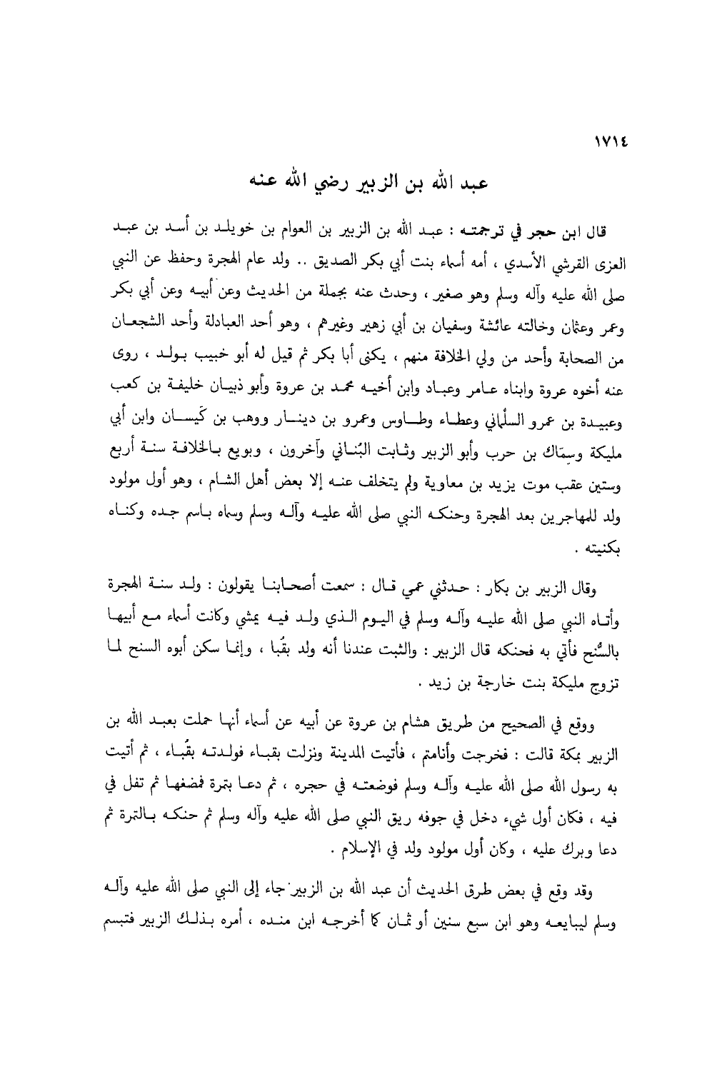قال ابن حجر في ترجمته: عبد الله بن الزبير بن العوام بن خويلد بن أسد بن عبد العزى القرشي الأسدي، أمه أسماء بنت أبي بكر الصديق .. ولد عام الهجرة وحفظ عن النبي صلى الله عليه وآلة وسلم وهو صغير، وحدث عنه بجملة من الحديث وعن أبيه وعن أبي بكر وعمر وعثمان وخالته عائشة وسفيان بن أبي زهير وغيرهم، وهو أحد العبادلة وأحد الشجعان من الصحابة وأحد من ولي الخلافة منهم، يكنى أبا بكر ثم قيل له أبو خبيب بولد، روى عنه أخوه عروة وابناه عامر وعباد وابن أخيه محمد بن عروة وأبو ذبيان خليفة بن كعب وعبيدة بن عمرو السلماني وعطاء وطاوس وعمرو بن دينار ووهب بن كيسان وابن أبي مليكة وسماك بن حرب وأبو الزبير وثابت البناني وآخرون، وبويع بالخلافة سنة أربع وستين عقب موت يزيد بن معاوية ولم يتخلف عنه إلا بعض أهل الشام، وهو أول مولود ولد للمهاجرين بعد الهجرة وحنكه النبي صلى الله عليه وآلة وسلم وسماه باسم جده وكناه بكنيته.