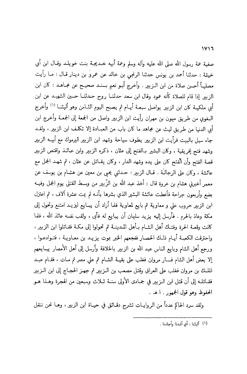 صفية عمة رسول الله صلى الله عليه وآله وسلم وعمة أبيه خديجة بنت خويلد وقال ابن أبي خيثمة: حدثنا أحمد بن يونس حدثنا الرنجي بن خالد عن عمرو بن دينار قال: ما رأيت مصلياً أحسن صلاة من ابن الزبير. وأخرج أبو نعيم بسند صحيح عن مجاهد: كان ابن الزبير إذا قام للصلاة كأنه عمود وقال ابن سعد حدثنا روح حدثنا حسين الشهيد عن ابن أبي مليكة كان ابن الزبير يواصل سبعة أيام ثم يصبح اليوم الثامن وهو أليثنا (1) وأخرج البغوي من طريق ميمون بن مهران رأيت ابن الزبير واصل من الجمعة إلى الجمعة وأخرج ابن أبي الدنيا من طريق ليث عن مجاهد ما كان باب من العبادة إلا تكلف ابن الزبير، ولقد جاء سيل بالبيت فرأيت ابن الزبير يطوف سياحة وشهد ابن الزبير وشهد فتح إفريقية، وكان البشير بالفتح إلى عثمان، ذكره الزبير وابن عائذ واقتص الزبير قصة الفتح وأن الفتح كان على يده وشهد الدار، وكان يقاتل عن عثمان، ثم شهد الجمل مع عائشة، وكان على الرجالة. قال الزبير: حدثني يحيى بن معين عن هشام بن يوسف عن معمر أخبرني هشام بن عروة قال: أخذ عبد الله بن الزبير من وسط القتلى يوم الجمل وفيه بضع وأربعون جراحة فأعطيت عائشة البشير الذي بشرها بأنه لم يمت عشرة آلاف، ثم اعتزل ابن الزبير حروب علي ومعاوية ثم بايع لمعاوية فلما أراد أن يبايع ليزيد امتنع وتحول إلى مكة وعاذ بالحرم. فأرسل إليه يزيد سليمان أن يبايع له فأبى، ولقب نفسه عائذ الله، فلما كانت وقعة الحرة وفتك أهل الشام بأهل المدينة ثم تحولوا إلى مكة فقاتلوا ابن الزبير، واحترقت الكعبة أيام ذلك الحصار ففجعهم الخبر بموت يزيد بن معاوية، فتوادعوا، ورجع أهل الشام وبايع الناس عبد الله بن الزبير بالخلافة وأرسل إلى أهل الأمصار يبايعهم إلا بعض أهل الشام فسار مروان فغلب على بقية الشام ثم علي مصر ثم مات، فقام عبد الملك بن مروان فغلب على العراق وقتل مصعب بن الزبير ثم جهز الحجاج إلى ابن الزبير فقاتله إلى أن قتل ابن الزبير في جمادى الأولى سنة ثلاث وسبعين من الهجرة وهذا هو المحفوظ وهو قول الجمهور. اهـ.