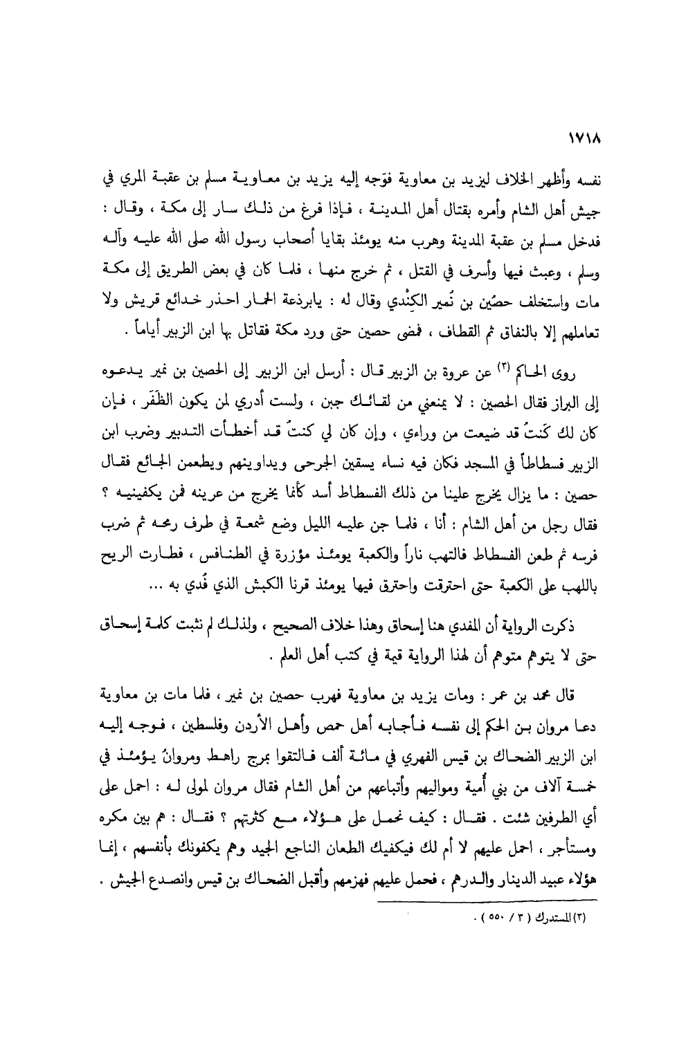 نفسه وأظهر الخلاف ليزيد بن معاوية فوجه إليه يزيد بن معاوية مسلم بن عقبة المري في جيش أهل الشام وأمره بقتال أهل المدينة، فإذا فرغ من ذلك سار إلى مكة، وقال: فدخل مسلم بن عقبة المدينة وهرب منه يومئذ بقايا أصحاب رسول الله صلى الله عليه وآله وسلم، وعبث فيها وأسرف في القتل، ثم خرج منها، فلما كان في بعض الطريق إلى مكة مات واستخلف حصين بن نمير الكندي وقال له: يا برذعة الحمار احذر خدائع قريش ولا تعاملهم إلا بالنفاق ثم القطاف، فمضى حصين حتى ورد مكة فقاتل بها ابن الزبير أياماً.