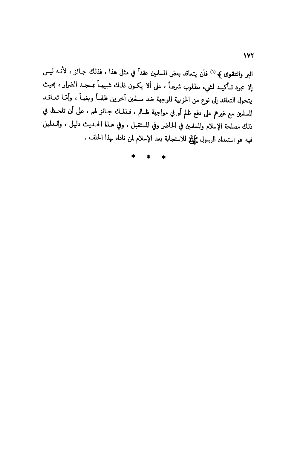 الْبِرِّ وَالتَّقْوَى} (1) فأن يتعاقد بعض المسلمين عقداً في مثل هذا، فذلك جائز، لأنه ليس إلا مجرد تأكيد لشيء مطلوب شرعاً، على ألا يكون ذلك شبيهاً بمسجد الضرار، بحيث يتحول التعاقد إلى نوع الحزبية الموجهة ضد مسلمين آخرين ظلماً وبغياً، وأما تعاقد المسلمين مع غيرهم على دفع ظلم أو في مواجهة ظالم، فذلك جائز لهم، على أن تلحظ في ذلك مصلحة الإسلام والمسلمين في الحاضر وفي المستقبل، وفي هذا الحديث دليل، والدليل فيه هو استعداد الرسول صلى الله عليه وسلم للاستجابة بعد الإسلام لمن ناداه بهذا الحلف.