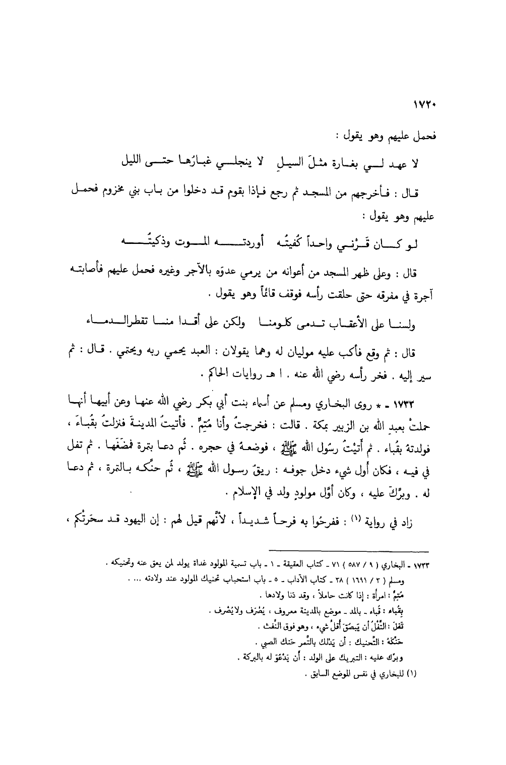 1733 - * روى البخاري ومسلم عن أسماء بنت أبي بكر رضي الله عنها وعن أبيها أنها حملت بعبد الله بن الزبير بمكة. قالت: فخرجت وأنا متم. فأتيت المدينة فنزلت بقباء، فولدته بقباء. ثم أتيت رسول الله صلى الله عليه وسلم، فوضعه في حجره. ثم دعا بتمرة فمضغها. ثم تفل في فيه، فكان أول شيء دخل جوفه: ريق رسول الله صلى الله عليه وسلم، ثم حنكه بالتمرة، ثم دعا له. وبرك عليه، وكان أول مولود ولد في الإسلام.