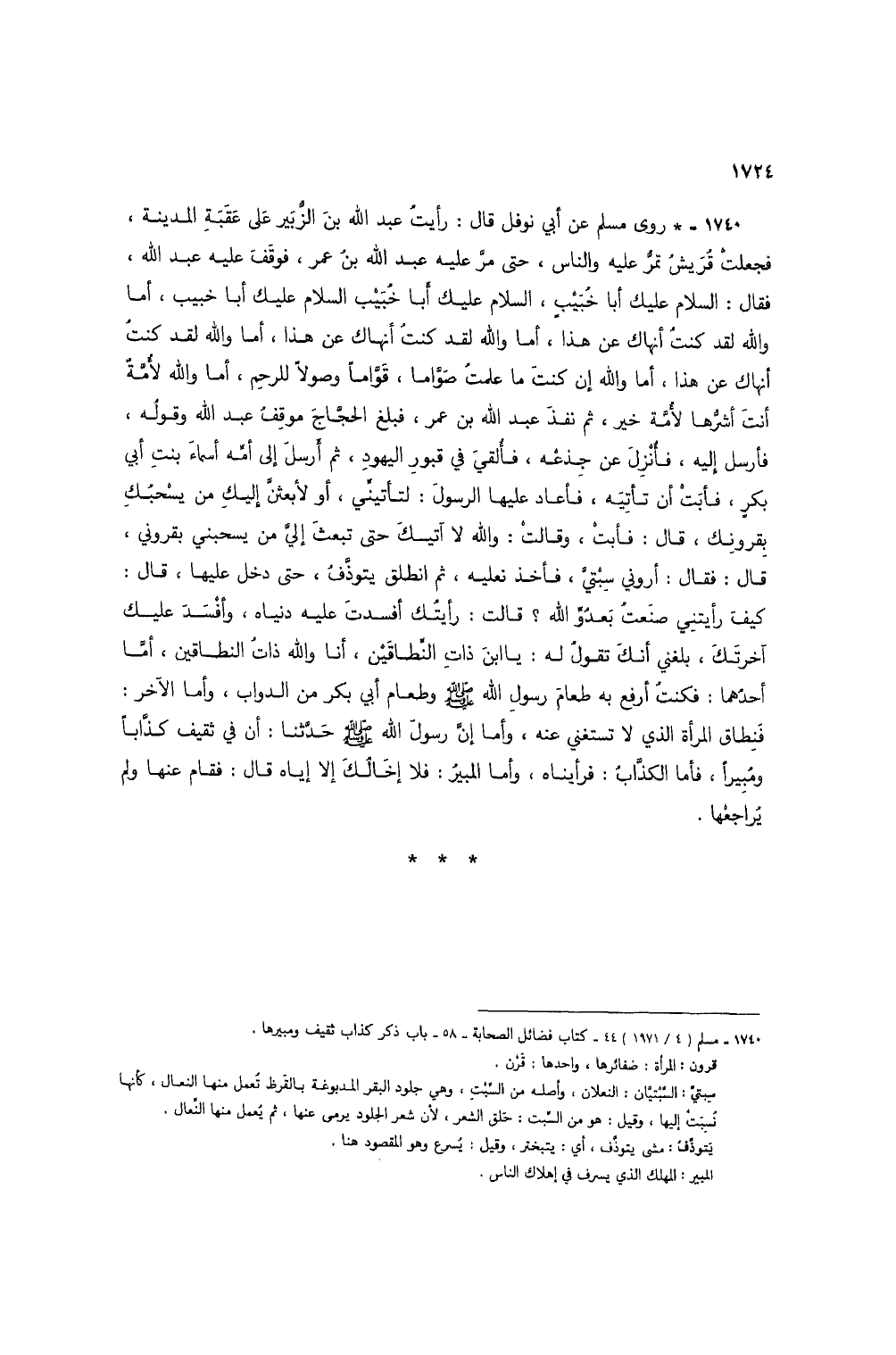 1740 - * روى مسلم عن أبي نوفل قال: رأيت عبد الله بن الزبير على عقبة المدينة، فجعلت قريش تمر عليه والناس، حتى مر عليه عبد الله بن عمر، فوقف عليه عبد الله، فقال: السلام عليك أبا خبيب، السلام عليك أبا خبيب السلام عليك أبا خبيب، أما والله لقد كنت أنهاك عن هذا، أما والله لقد كنت أنهاك عن هذا، أما والله لقد كنت أنهاك عن هذا، أما والله إن كنت ما علمت صواماً، قواماً وصولاً للرحم، أما والله لأمة أنت أشرها لأمة خير، ثم نفذ عبد الله بن عمر، فبلغ الحجاب موقف عبد الله وقوله، فأرسل إليه، فأنزل عن جذعه، فألقي في قبور اليهود، ثم أرسل إلى أمه أسماء بنت أبي بكر، فأبت أن تأتيه، فأعاد عليها الرسول: لتأتيني، أو لأبعثن إليك من يسحبك بقرونك، قال: فأبت، وقالت: والله لا آتيك حتى تبعث إلى من يسحبني بقروني، قال: فقال: أروني سبني، فأخذ نعليه، ثم انطلق يتوذف، حتى دخل عليها، قال: كيف رأيتني صنعت بعدو الله؟ قالت: رأيتك أفسدت عليه دنياه، وأفسد عليك آخرتك، بلغني أنك تقول له: يا ابن ذات النطاقين، أنا والله ذات النطاقين، أما أحدهما: فكنت أرفع به طعام رسول الله صلى الله عليه وسلم وطعام أبي بكر من الدواب، وأما الآخر: فنطاق المرأة الذي لا تستغني عنه، وأما إن رسول الله صلى الله عليه وسلم حدثنا: أن في تثقيف كذاباً ومبيراً، فأما الكذاب: فرأيناه، وأما المبير: فلا إخالك إلا إياه قال: فقام عنها ولم يراجعها.