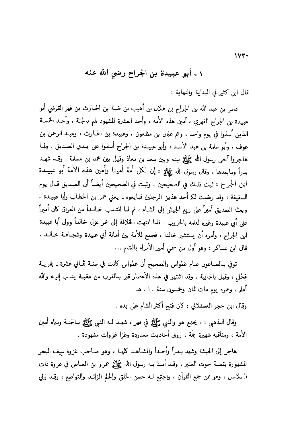 عامر بن عبد الله بن الجراح بن هلال بن أهيب بن ضبة بن الحارث بن فهر القرشي أبو عبيدة بن الجراح الفهري، أمين هذه الأمة، وأحد العشرة المشهود لهم بالجنة، وأحد الخمسة الذين أسلموا في يوم واحد، وهم عثمان بن مظعون، وعبيدة بن الحارث، وعبد الرحمن بن عوف، وأبو سلمة بن عبد الأسد، وأبو عبيدة بن الجراح أسلموا على يدي الصديق. ولما هاجروا آخى رسول الله صلى الله عليه وسلم بينه وبين سعد بن معاذ وقيل بين محمد بن مسلمة. وقد شهد بدراً وما بعدها، وقال رسول الله صلى الله عليه وسلم "إن لكل أمة أمينا وأمين هذه الأمة أبو عبيدة ابن الجراح" ثبت ذلك في الصحيحين. وثبت في الصحيحين أيضاً أن الصديق قال يوم السقيفة: وقد رضيت لكم أحد هذين الرجلين فبايعوه -يعني عمر بن الخطاب وأبا عبيدة- وبعثه الصديق أميراً على ربع الجيش إلى الشام، ثم لما انتدب خالداً من العراق كان أميراً على أبي عبيدة وغيره لعلمه بالحروب. فلما انتهت الخلافة إلى عمر عزل خالداً وولى أبا عبيدة ابن الجراح، وأمره أن يستشير خالدا، فجمع للأمة بين أمانة أبي عبيدة وشجاعة خالد. قال ابن عساكر: هو أول من سمي أمير الأمراء بالشام ....