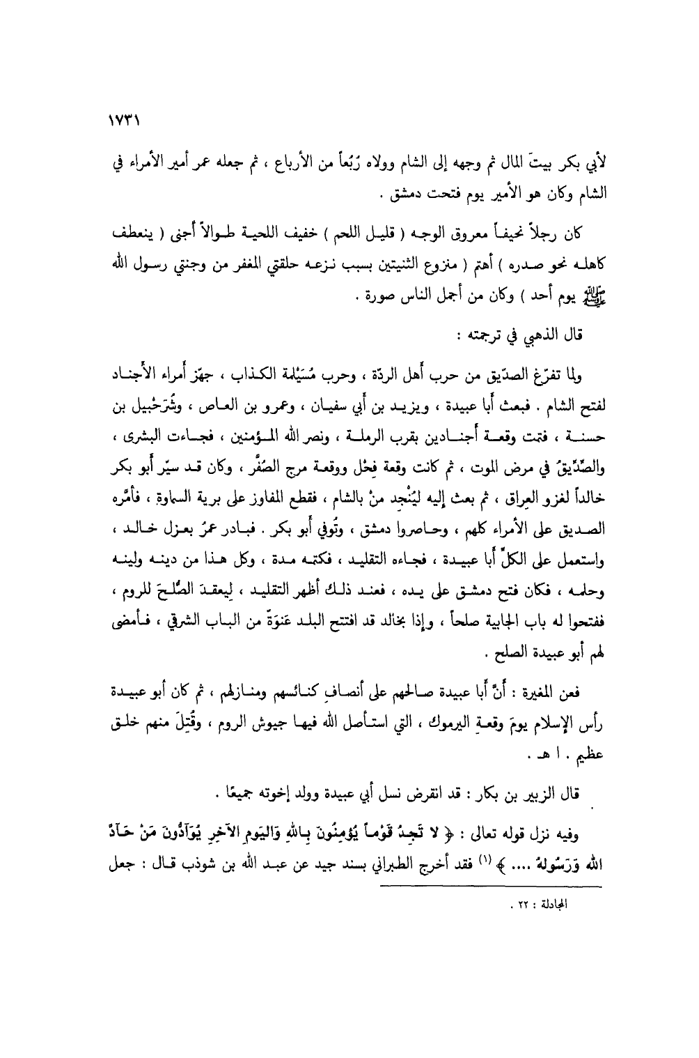 ولما تفرع الصديق من حرب أهل الردة، وحرب مسيلمة الكذاب، جهز أمراء الأجناد لفتح الشام. فبعث أبا عبيدة، وزيد ابن أبي سفيان، وعمرو بن العاص، وشرحبيل بن حسنه، فتمت وقعة أجنادين بقرب الرملة، ونصر الله المؤمنين، فجاءت البشرى، والصديق في مرض الموت، ثم كانت وقعة فحل ووقعة مرج الصفر، وكان قد سير أبوبكر خالداً لغزو العراق، ثم بعث إليه لينجد من بالشام، فقطع المفاوز على برية السماوة، فأمره الصديق على الأمراء كلهم، وحاصروا دمشق، وتوفي أبوبكر. فبادر عمر بعزل خالد، واستعمل على الكل أبا عبيدة، فجاءة التقليد، فكتمه مدة، وكل هذا من دينه ولينه وحلمه، فكان فتح دمشق على يده، فعند ذلك أظهر التقليد، ليعقد الصالح للروم، ففتحوا له باب الجابية صلحاً، وإذا بخالد قد افتتح البلد عنوة من الباب الشرقي، فأمضى لهم أبو عبيدة الصلح.