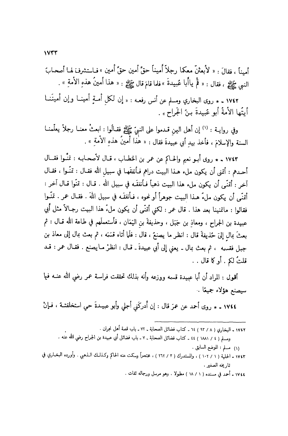1744 - * روى أحمد عن عمر قال: إن أدركني أجلي وأبو عبيدة حي استخلفته، فإن