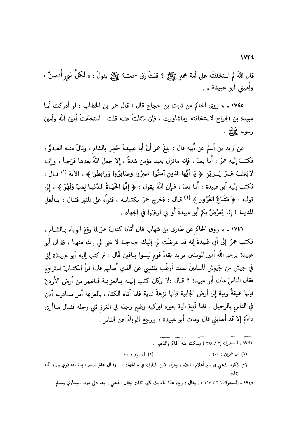 1745 - * روى الحاكم عن ثابت بن حجاج قال: قال عمر بن الخطاب: لو أدركت أبا عبيدة بن الجراح لاستخلفته وما شاورت. فإن سئلت عنه قلت: استخلفت أمين الله وأمين رسوله صلى الله عليه وسلم.