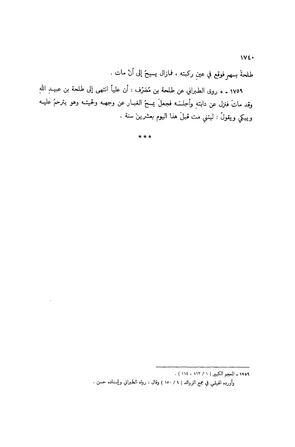 1759 - * روى الطبراني عن طلحة بن مصرف: أن عليا انتهى إلى طلحة بن عبيد الله وقد مات فنزل عن دابته وأجلسه فجعل يمسح الغبار عن وجهه ولحيته وهو يترحم عليه ويبكي ويقول: ليتني مت قبل هذا اليوم بعشرين سنة.