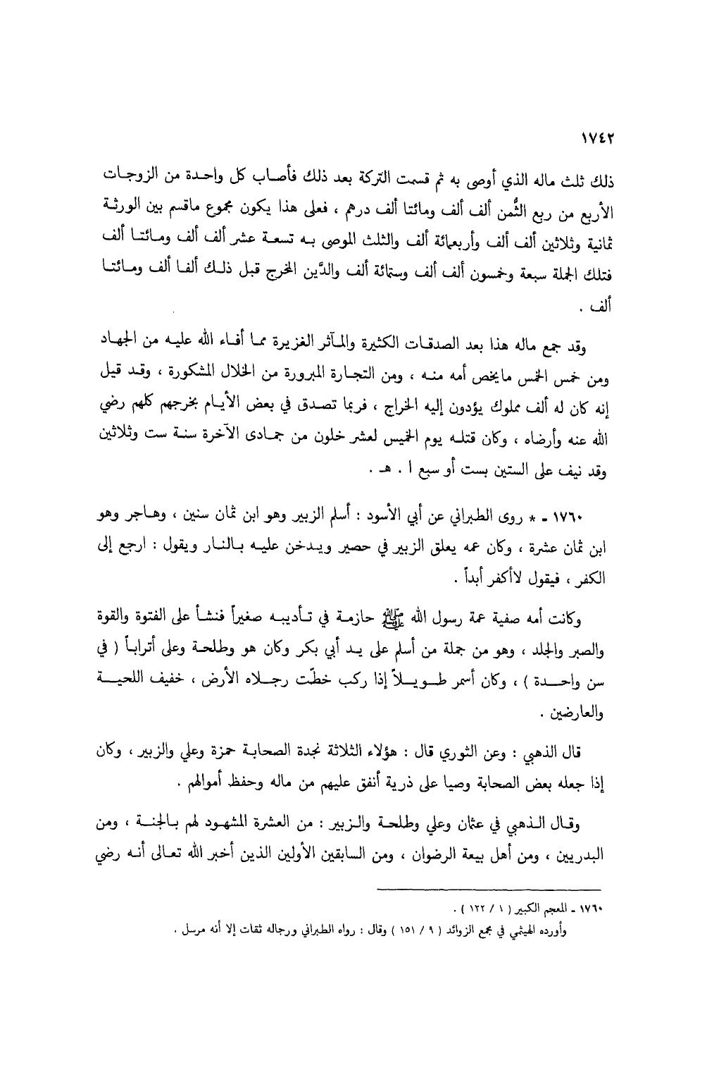 1760 - * روى الطبراني عن أبي الأسود: أسلم الزبير وهو ابن ثمان سنين، وهاجر وهو ابن ثمان عشر، وكان عمه يعلق الزبير في حصير ويدخن عليه بالنار ويقول: ارجع إلى الكفر، فيقول لا أكفر أبدا.