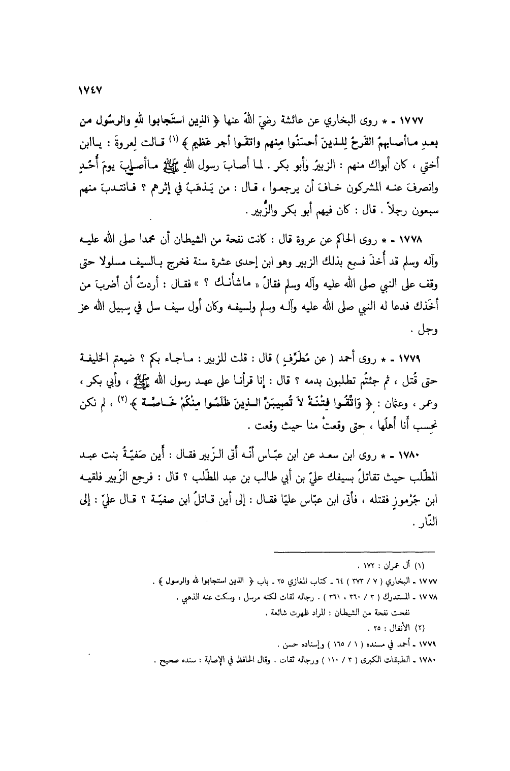 1777 - * روى البخاري عن عائشة رضي الله عنها {الَّذِينَ اسْتَجَابُوا لِلَّهِ وَالرَّسُولِ مِنْ بَعْدِ مَا أَصَابَهُمُ الْقَرْحُ لِلَّذِينَ أَحْسَنُوا مِنْهُمْ وَاتَّقَوْا أَجْرٌ عَظِيمٌ} (2) قالت لعروة: يا ابن أختي، كان أبواك منهم: الزبير وأبو بكر. لما أصاب رسول الله صلى الله عليه وسلم ما أصاب يوم أحد وانصرف عنه المشركون خاف أن يرجعوا، قال: من يذهب في إثرهم؟ فانتدب منهم سبعون رجلا. قال: كان فيهم أبو بكر والزبير.