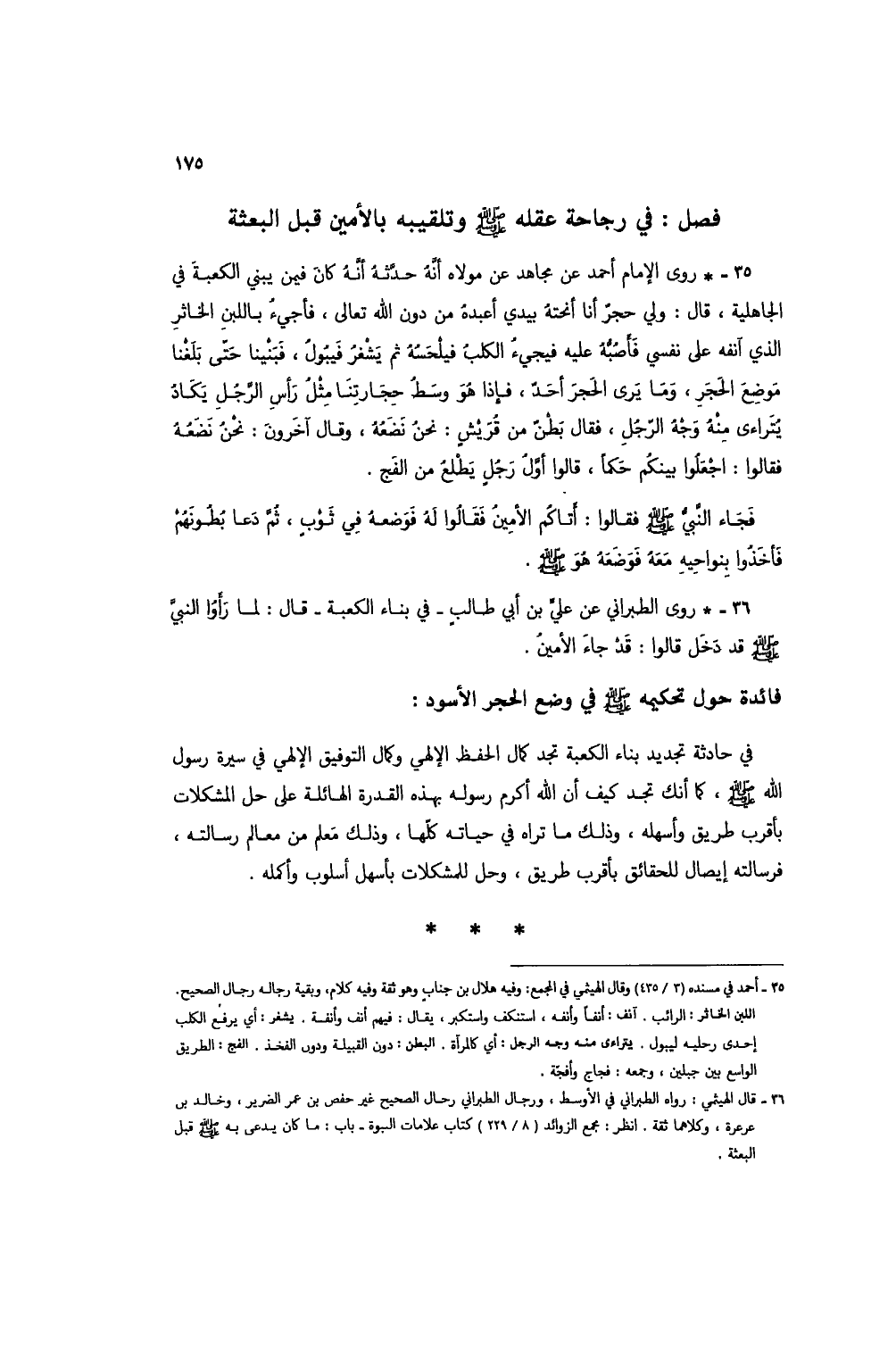 35 - * روى الإمام أحمد عن مجاهد عن مولاه أنه حدثه أنه كن فيمن يبني الكعبة في الجاهلية، قال: ولي حجر أنا أنحته بيدي أعبده من دون الله تعالى، فأجيء باللبن الخاثر الذي آنفه على نفسي فأصبه عليه فيجيء الكلب فيلحسه ثم يشفر فيبول، فبنينا حتى بلغنا موضع لحجر، وما يرى الحجر أحدٌ، فإذا هو وسط حجارتنا مثل رأس الرجل يكاد يتراءى منه وجه الرجل، فقال بطن من قريش: نحن نضعه، وقال آخرون: نحن نضعه فقالوا: اجعلوا بينكم حكماً، قالوا أول رجلٍ يطلع من الفج.