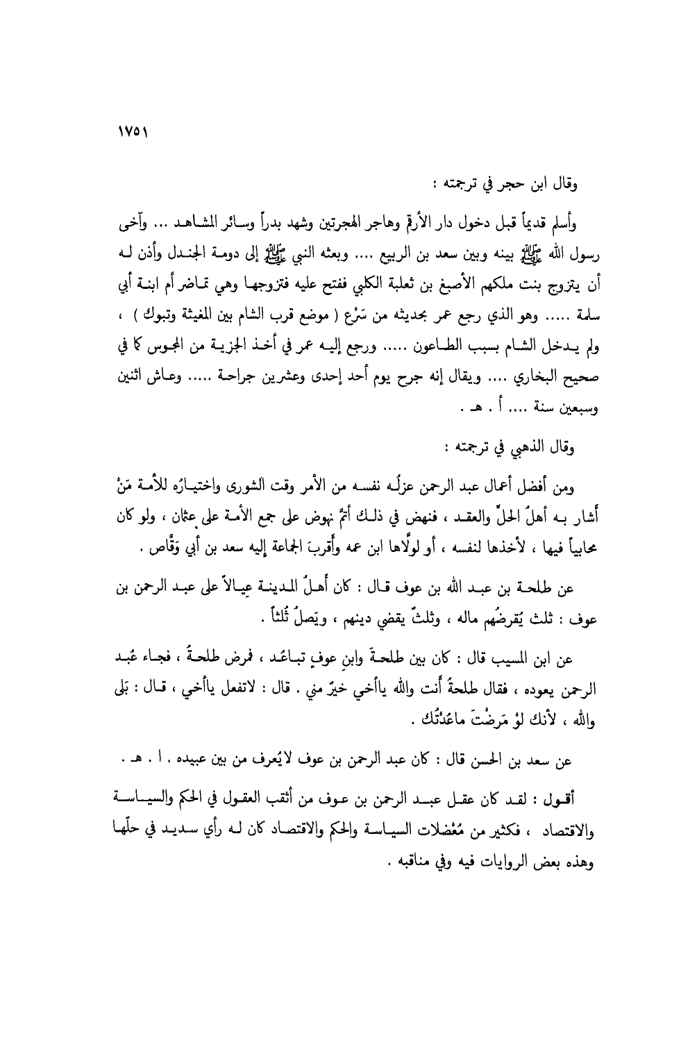 وأسلم قديماً قبل دخول دار الأرقم وهاجر الهجرتين وشهد بدراً وسائر المشاهد .. وآخى رسول الله صلى الله عليه وسلم بينه وبين سعد بن الربيع ... وبعثه النبي صلى الله عليه وسلم إلى دومة الجندل وأذن له أن يتزوج بنت ملكهم الأصبغ بن ثعلبة الكلبي ففتح عليه فتزوجها وهي تماضر أم ابنة أبي سلمة ... وهو الذي رجع عمر بحديثه من سرع (موضع قرب الشام بين المغيثة وتبوك)، ولم يدخل الشام بسبب الطاعون ... ورجع إليه عمر في أخذ الجزية من المجوس كما في صحيح البخاري ... ويقال إنه جرح يوم أحد إحدى وعشرين جراحة ... وعاش اثنين وسبعين سنة ... ا. هـ.
