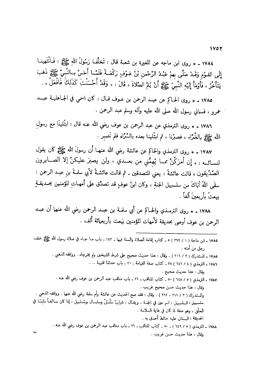 1788 - * روى الترمذي والحاكم عن أبي سلمة بن عبد الرحمن رضي الله عنهما أن عبد الرحمن بن عوف أوصى بحديقة لأمهات المؤمنين بيعت بأربعمائة ألف.