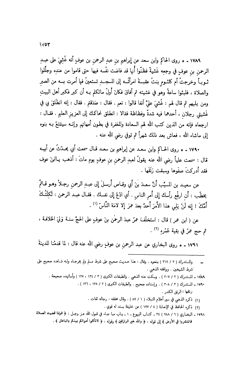 1790 - * روى الحاكم وابن سعد عن إبراهيم بن سعد قال سمعت أبي يحدث عن أبيه قال: سمعت علياً رضي الله عنه يقول لعبد الرحمن بن عوف يوم مات: أذهب يا ابن عوف فقد أدركت صفوها وسبقت رنقها.