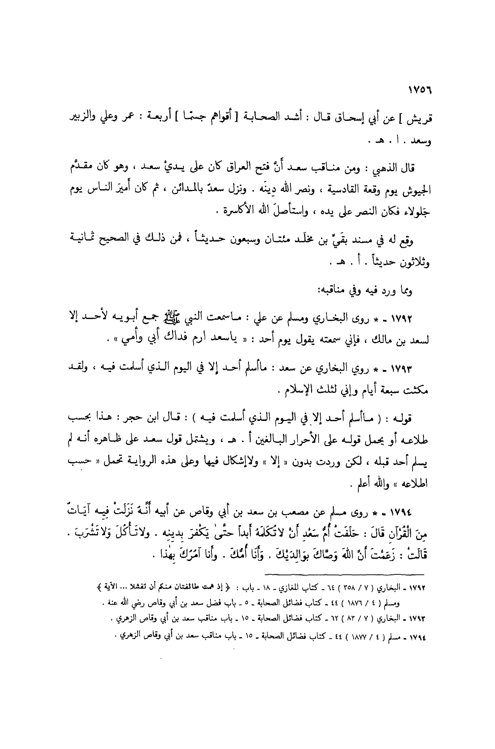 1793 - البخاري (7/ 83) 62 - كتاب فضائل الصحابة -15 - باب فضل سعد بن أبي وقاص الزهري.
