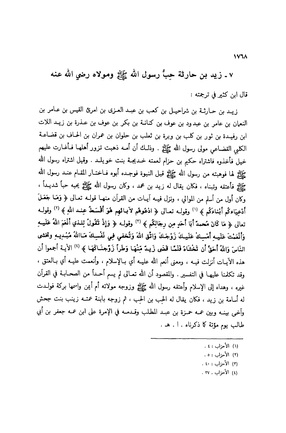 زيد بن حارثة بن شراحيل بن كعب بن عبد العزى بن أمريء القيس بن عامر بن النعمان بن عامر بن عبد ود بن عوف بن كنانة بن بكر بن عوف بن عذرة بن زيد اللات ابن رفيدة بن ثور بن كلب بن وبرة بن ثعلب بن حلوان بن عمران بن الحاف بن قضاعة الكلبي القضاعي مولى رسول الله صّلى الله عليه وسلم. وذلك أن أمه ذهبت تزور أهلها فأغارت عليهم خيل فأخذوه فاشتراه حكيم بن حزام لعمته خديجة بنت خويلد. وقيل اشتراه رسول الله صّلى الله عليه وسلم لها فوهبته من رسول الله صّلى الله عليه وسلم قبل النبوة فوجده أبوه فاختار المقام عند رسول الله صّلى الله عليه وسلم فأعتقه وتبناه، فكان يقال له زيد بن محمد، وكان رسول الله صّلى عليه وسلم يحبه حباً شديداَ، وكان أول من أسلم من الموالي، ونزل فيه آيات من القرآن منها قوله تعالى: {وَمَا جَعَلَ أَدْعِيَاءَكُمْ أَبْنَاءَكُمْ} (1) وقوله تعالى {ادْعُوهُمْ لِآبَائِهِمْ هُوَ أَقْسَطُ عِنْدَ اللَّهِ} (2) وقوله تعالى: {مَا كَانَ مُحَمَّدٌ أَبَا أَحَدٍ مِنْ رِجَالِكُمْ} (3) وقوله {وَإِذْ تَقُولُ لِلَّذِي أَنْعَمَ اللَّهُ عَلَيْهِ وَأَنْعَمْتَ عَلَيْهِ أَمْسِكْ عَلَيْكَ زَوْجَكَ وَاتَّقِ اللَّهَ وَتُخْفِي فِي نَفْسِكَ مَا اللَّهُ مُبْدِيهِ وَتَخْشَى النَّاسَ وَاللَّهُ أَحَقُّ أَنْ تَخْشَاهُ فَلَمَّا قَضَى زَيْدٌ مِنْهَا وَطَرًا زَوَّجْنَاكَهَا} (4) الآية أجمعوا أن هذه الآيات أنزلت فيه، ومعني أنعم الله عليه أي بالإسلام، وأنعمت عليه أي بالعتق، وقد تكلمنا عليها في التفسير. والمقصود أن الله تعالى لم يسم أحداُ من الصحابة في القرآن غيره، وهداه إلى الإسلام وأعتقه رسول الله صّلى الله عليه وسلم وزوجه مولاته أم أيمن واسمها بركة فولدت له أسامة بن زيد، فكان يقال له الحِب بن الحِب، ثم زوجه بابنة عمته زينب بنت جحش وآخي بينه وبين عمه حمزة بن عبد المطلب وقدمه في الإمرة على ابن عمه جعفر بن أبي طالب يوم مؤتة كما ذكرناه. أ. هـ