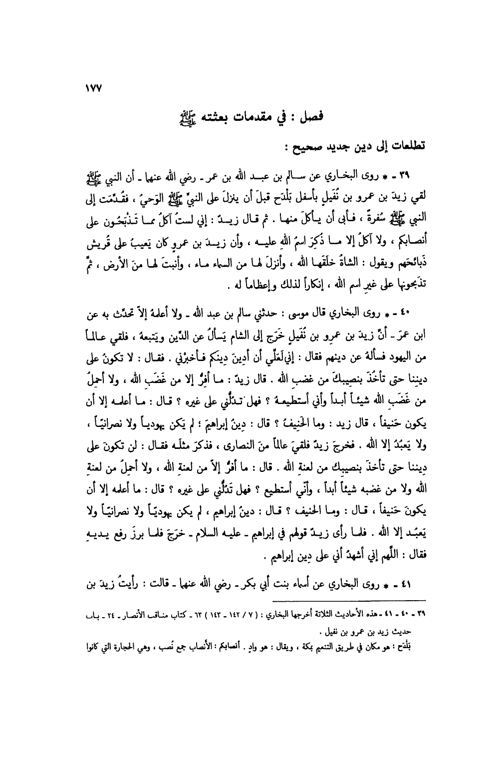 40 - * روى البخاري قال موسى: حدثني سالم بن عبد الله - ولا أعلمهُ إل تحدث به عن ابن عمر - أن زيد بن عمرو بن نُفيلٍ خرج إلى الشام يسأل عن الدين ويتبعه، فلقي عالماً من اليهود فسأله عن دينهم فقال: إني لعلي أن أدين دينكم فأخبرني. فقال: لا تكون على ديننا حتى تأخذ بنصيبك من غضب الله. قال زيدٌ: ما أفرُّ إلا من غضب الله، ولا أحمل من غضب الله شيئاً أبداً وأني أستطيعه؟ فهل تدلني على غيره؟ قال: ما أعلمه إلا أن يكون حنيفاً، قال زيد: وما الحنيف؟ قال: دينُ إبراهيم؛ لم يكن يهودياً ولا نصرانيا، ولا يعبد إلا الله. فخرج زيدٌ فلقي عالماً من النصارى، فذكر مثله فقال: لن تكون على ديننا حتى تأخذ بنصيبك من لعنة الله. قال: ما أفرُّ إلا من لعنة الله، ولا أحملُ من لعنةِ الله ولا من غضبه شيئاً أبداً، وأني أستطيع؟ فهل تدلُّني على غيره؟ قال: ما أعلمه إلا أن يكون حنيفاً، قال: وما الحنيف؟ قال: دين إبراهيم، لم يكن يهودياً ولا نصرانياً ولا يعبد إلا الله. فلما رأى زيدٌ قولهم في إبراهيم - عليه السلام - خرج فلما برز رفع يديه فقال: اللهم إني أشهدُ أني على دين إبراهيم.