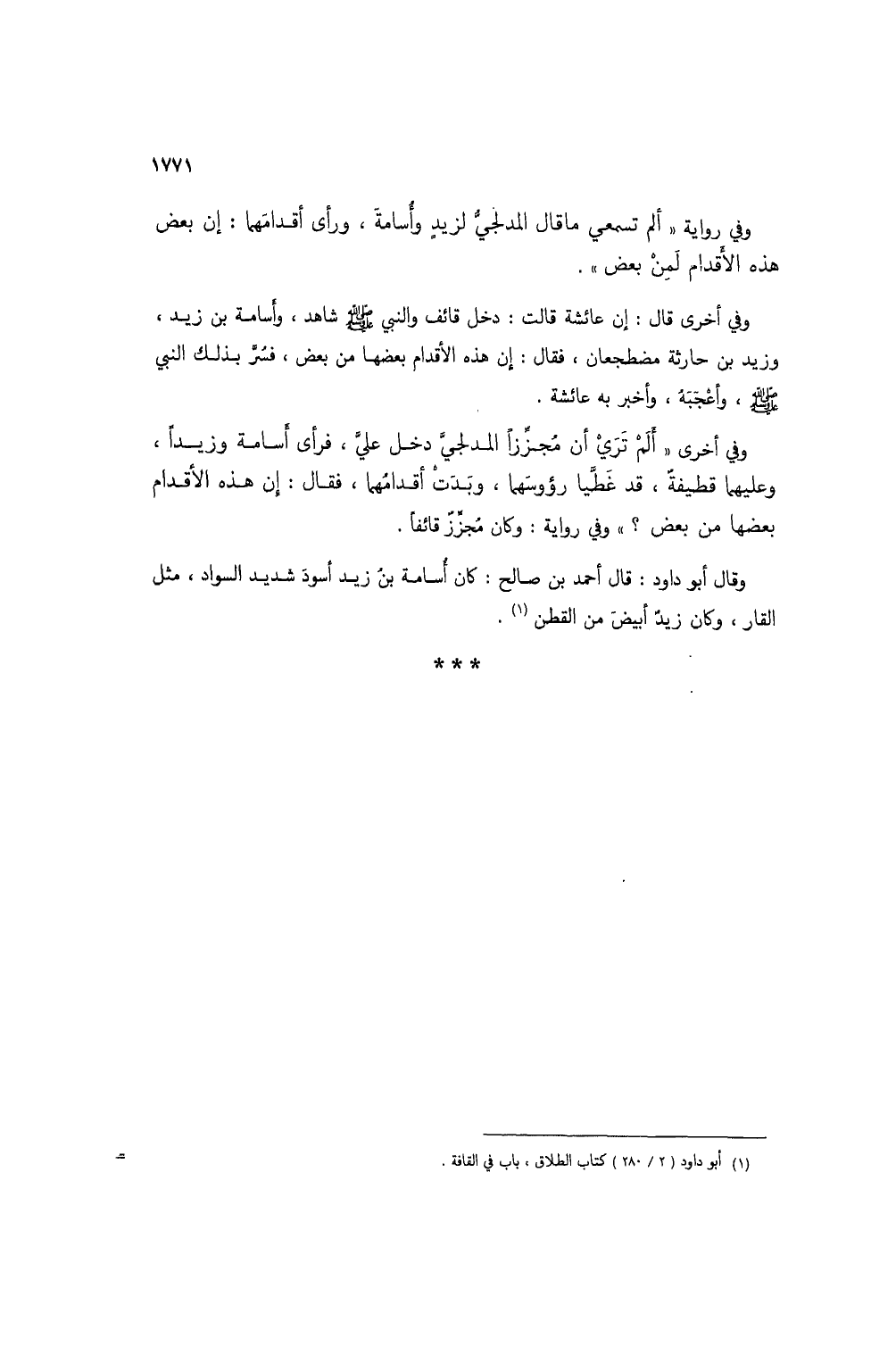 وفي آخري "أَلَمْ تَرَيْ أن مُجزِّزاُ المدلجيَّ دخل عليَّ، فرأي أَسامة وزيداً، وعليهما قطيفةُ، قد غَطَّيا رؤوسَهما، وبَدَتْ أقدامهما، فقال: إن هذه الأقدام بعضها من بعض؟ " وفي رواية: وكان مُجزِّزُ قائفاً.