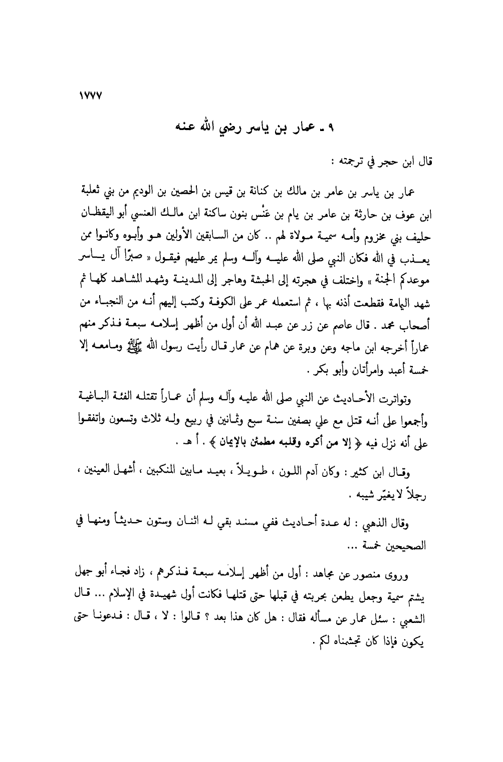 وتواترت الأحاديث عن النبي صلى الله عليه وآله وسلم أن عماراً تقتله الفئة الباغية وأجمعوا على أنه قتل مع علي بصفين سنة سبع وثمانين في ربيع وله ثلاث وتسعون واتفقوا على أنه نزل فيه {إِلَّا مَنْ أُكْرِهَ وَقَلْبُهُ مُطْمَئِنٌّ بِالْإِيمَانِ}. أهـ.