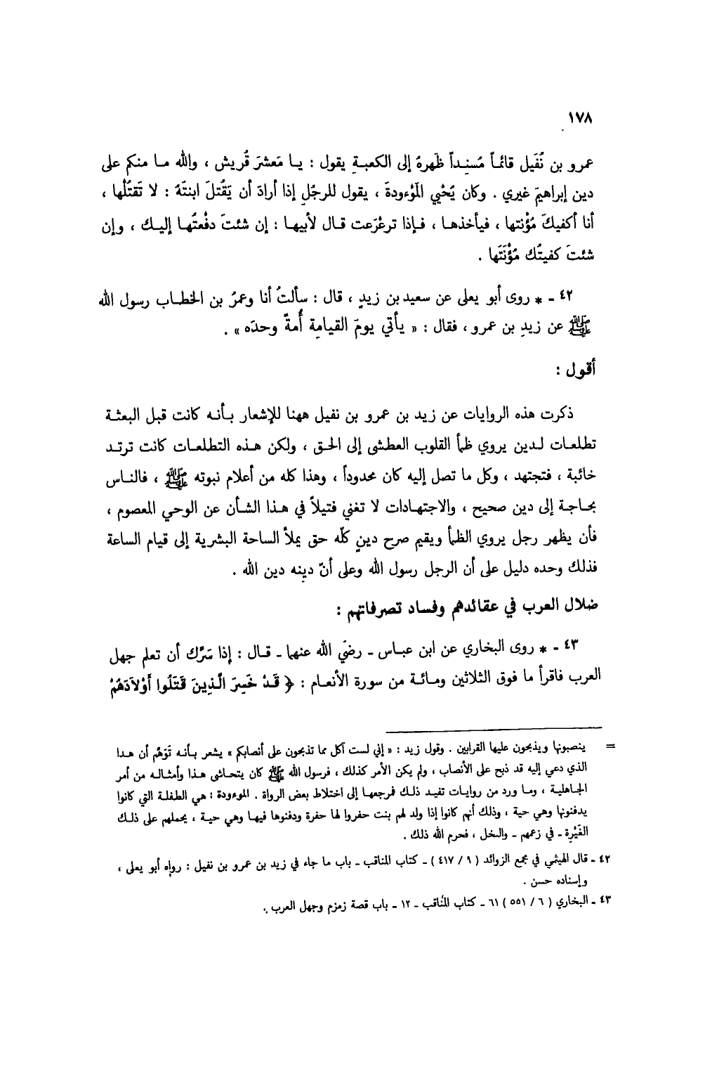 عمرو بن نُفيل قائماً مُسنداً ظهرهُ إلى الكعبة يقول: يا معشر قريش، والله ما منكم على دين إبراهيم غيري. وكان يحيى الموءودة، يقول للرجل إذا أراد أن يقتل ابنتهُ: لا تقتلها، أنا أكفيك مؤنتها، فيأخذها، فإذا ترعرعت قال لأبيها: إن شئت دفعتها إليك، وإن شئت كفيتك مؤنتها.