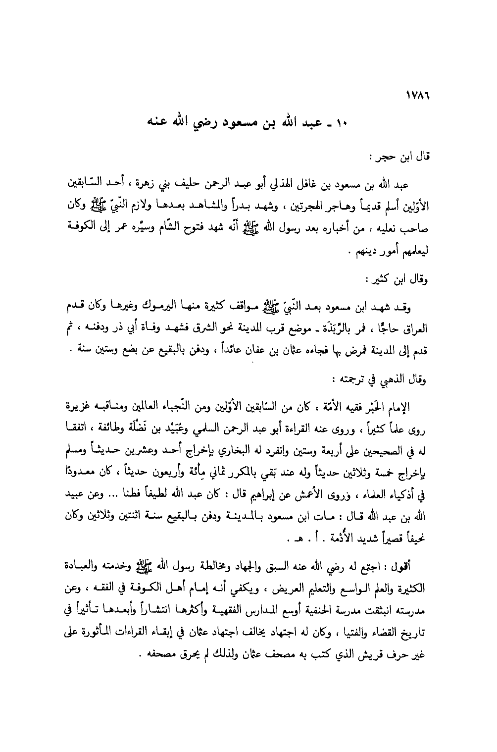 الإمام الَحّبر فقيه الأمّة، كان من السّابقين الأوّلين ومن النّجباء العالمين ومناقبه غزيرة روى علماً كثيراً، وروى عنه القراءة أبو عبد الرحمن السلمي وعُبَيْد بن نَضْلَة وطائفة، اتفقا له في الصحيحين على أربعة وستين وانفرد له البخاري بإخراج أحد وعشرين حديثاً ومسلم بإخراج خمسة وثلاثين حديثاً وله عند بَقي بالمكرر ثماني مِأئة وأربعون حديثاً، كان معدوداً في أذكياء العلماء، وروى الأعمش عن إبراهيم قال: كان عبد الله لطيفاً فطناً .... وعن عبيد الله بن عبد الله قال: مات ابن مسعود بالمدينة ودفن بالبقيع سنة اثنتين وثلاثين وكان نحيفاً قصيراً الأدمة. أ. هـ.