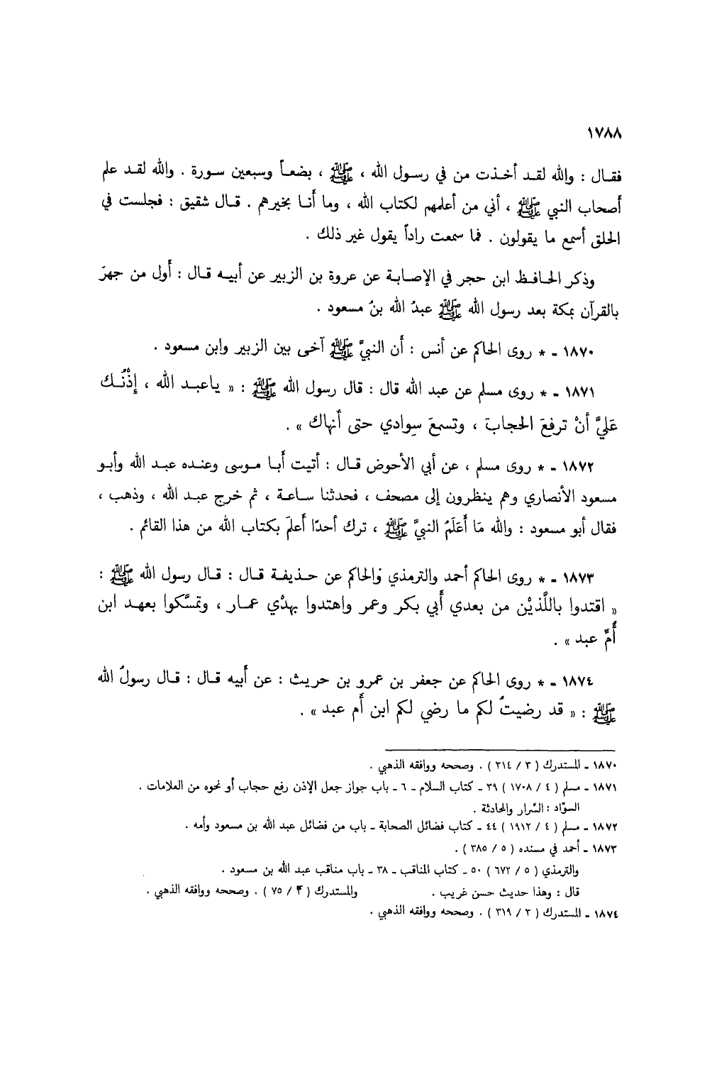 1874 - * روى الحاكم عن جعفر بن عمرو بن حريث: عن أبيه قال: قال رسولُ الله صلى الله عليه وسلم: "قد رضيتّ لكم ما رضي لكم ابن أُم عبد".